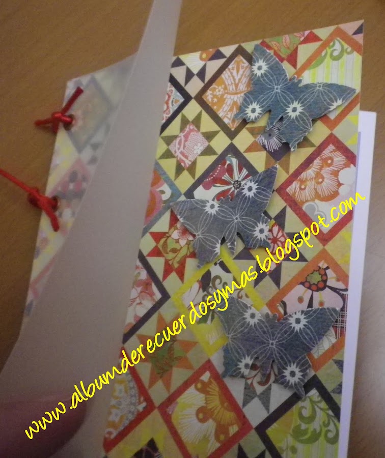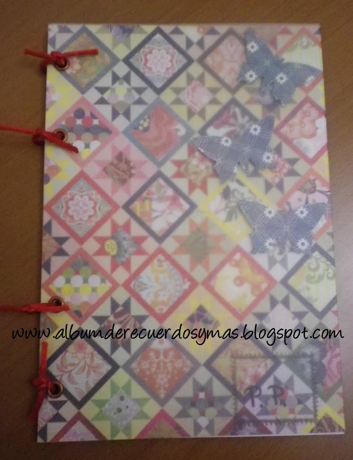 Os enseño un cuaderno que he hecho para una GRAN AMIGA, la verdad, que fué ver ese papel de la portada y saber que varias personas a las que regalarles algo utilizándolo. El cuaderno esta hecho integramente a mano. Cortar los folios, cortar y forrar tapas, encuadernarlo, decorar ... Es algo con lo que me estreno porque nunca antes lo había hecho y he de decir que me tiene enganchada.