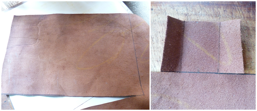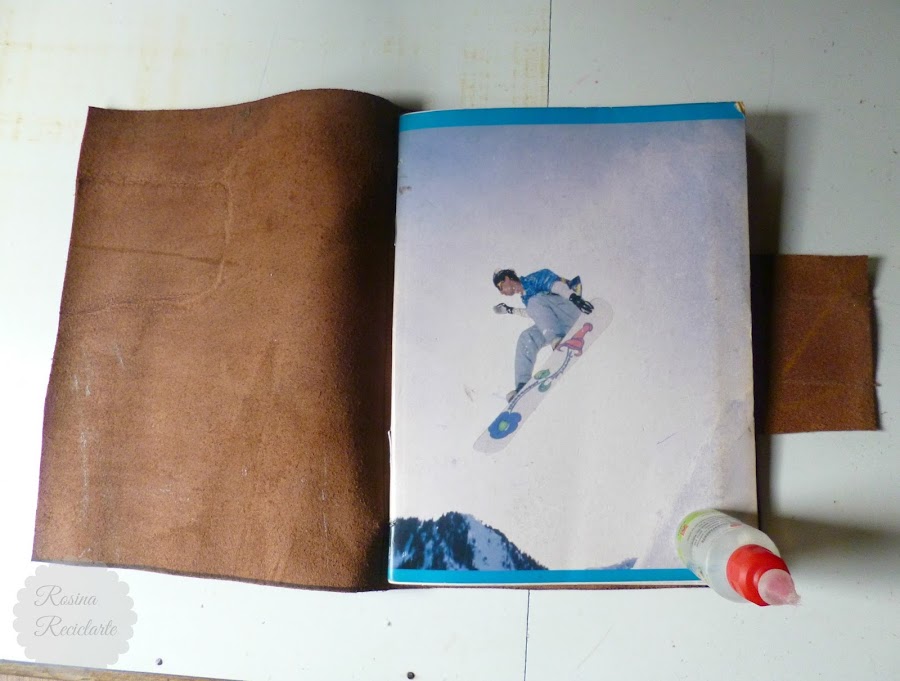 1-Cortar el cuero 0,5 mm más grande que las tapas y agregarle una "lengüeta" que hará las veces de cierre.