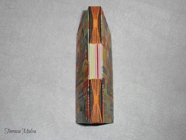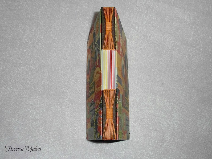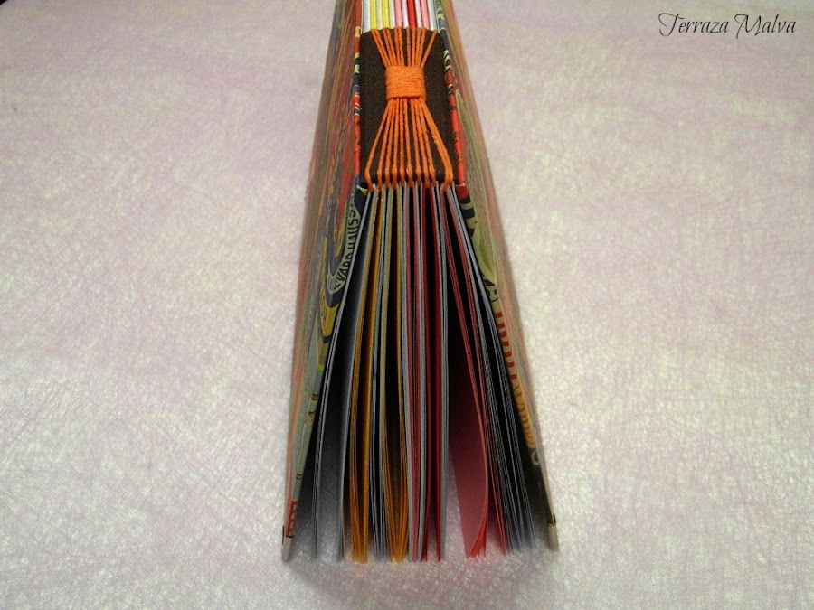 Como adorno he enrollado un poco de cordón juntando los hilos de la costura para romper las líneas paralelas que formaban la costura y los cantos de los cuadernillos.