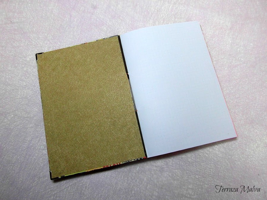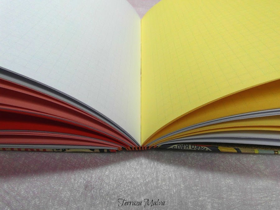 En los cuadernillos interiores he usado papel Oxford de varios colores combinando con los tonos del papel de la portada. En todos ellos he impreso una trama cuadriculada tenue pero que sirve de guía para la escritura. Es un tipo de papel en el que la tinta de las plumas y bolígrafos de gel no se transparenta de una cara a otra y su precio es casi igual al de folios de menor calidad.
