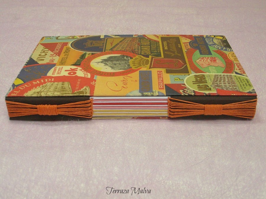 Me encanta el papel que he utilizado para la cubierta, con logotipos de hoteles de todo el mundo.