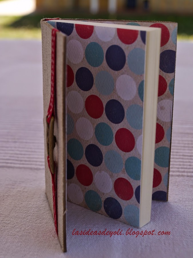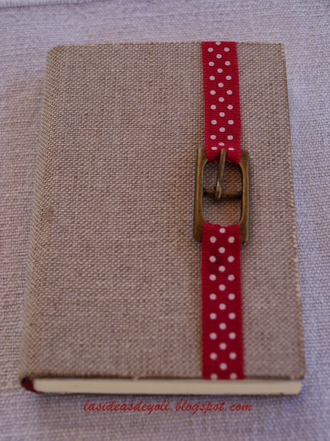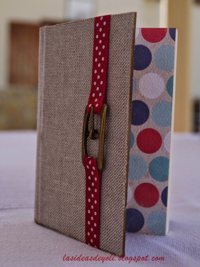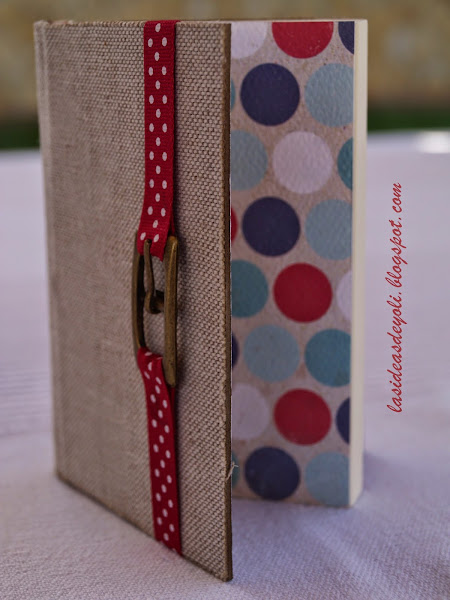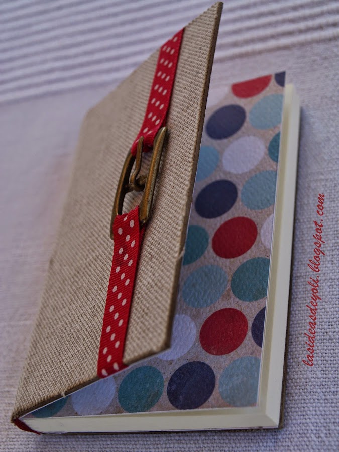 Espero que os guste este pequeño cuaderno de notas que he realizado con tela de arpillera en el encuadernado exterior, con cinta y cierre de hebilla. Como guardas un papel de scrap precioso en lunares.