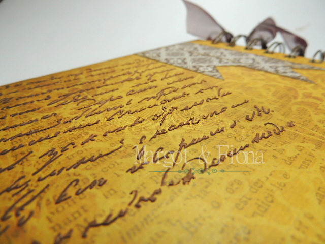Y ya el reverso, destaca sobre todo con el embosado de escritura manuscrita, hecho con el stencil Manuscrito y embosado en color oro.
