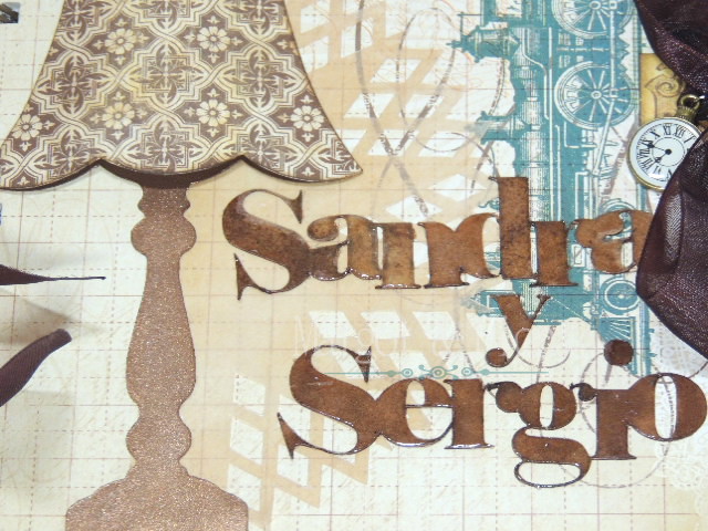 Toda la letras son troqueles hechos con la S. cameo, y trabajados como un falso Chipboard, teñidos con distress Vintage Photo y embosados con polvos UTEE clear.