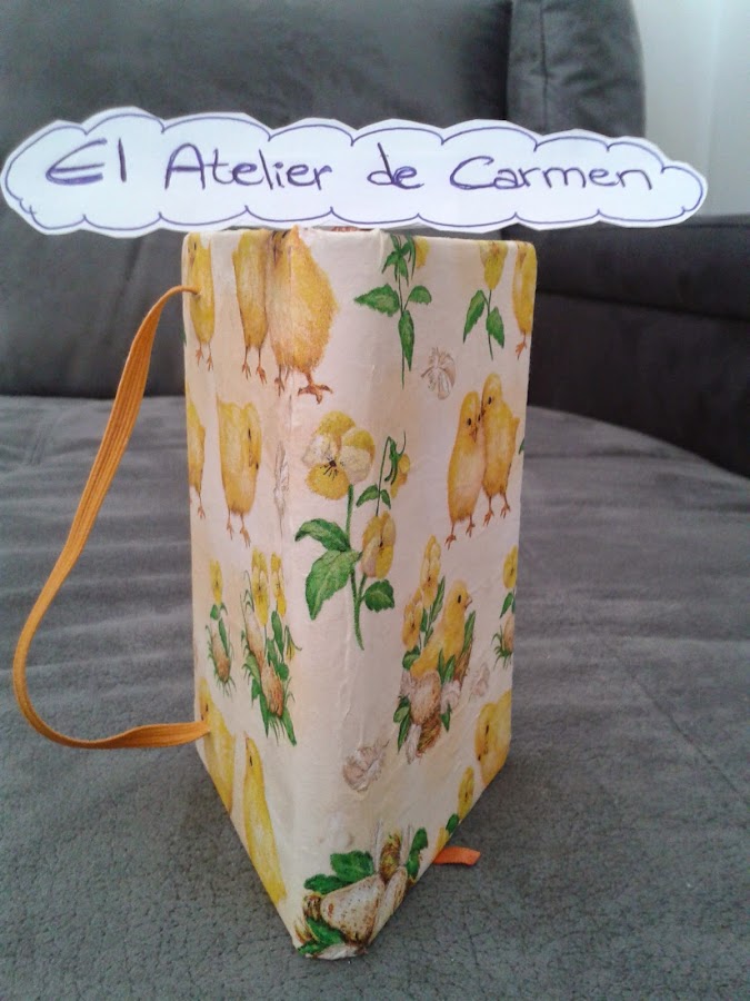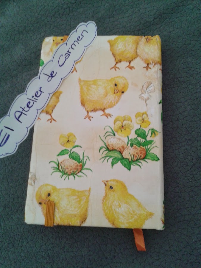 Está realizado con la técnica de decoupage, como ya sabéis, y he utilizado una servilleta de pollitos en tonos amarillos y verdes, me parece ideal para cualquier trabajo, porque no tiene un motivo determinado (cocina, bebes...) además me venia genial porque tanto la goma de cierre del cuaderno como la cinta separadora interior son en tonos anaranjados, con lo cual... me ha venido como anillo al dedo! jiji