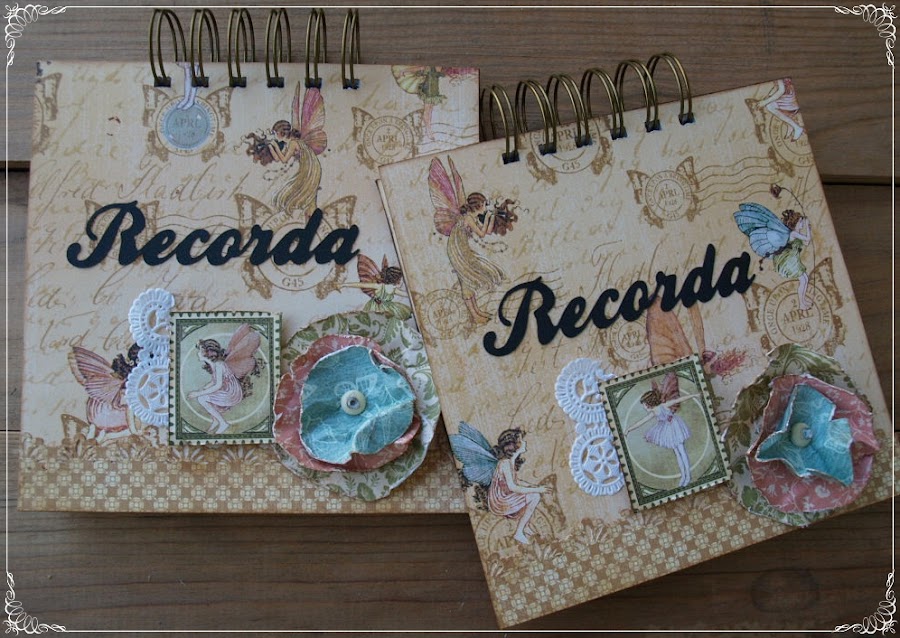Eva me pidió que los cuadernos estuvieran hechos con estos papeles así que he hecho dos parejas de dos modelos y uno distinto. Todos llevan una base muy estampada, y unos adornos en 3D, que rompen con lo plano y hacen salir a los personajes del fondo...las hadas, los pajaritos y la reina...junto a flores, cintas, glossy , cenefas troqueladas y fantasía. Una palabra como titulo y encuadernación con espiral bronce de la bind-it-all.