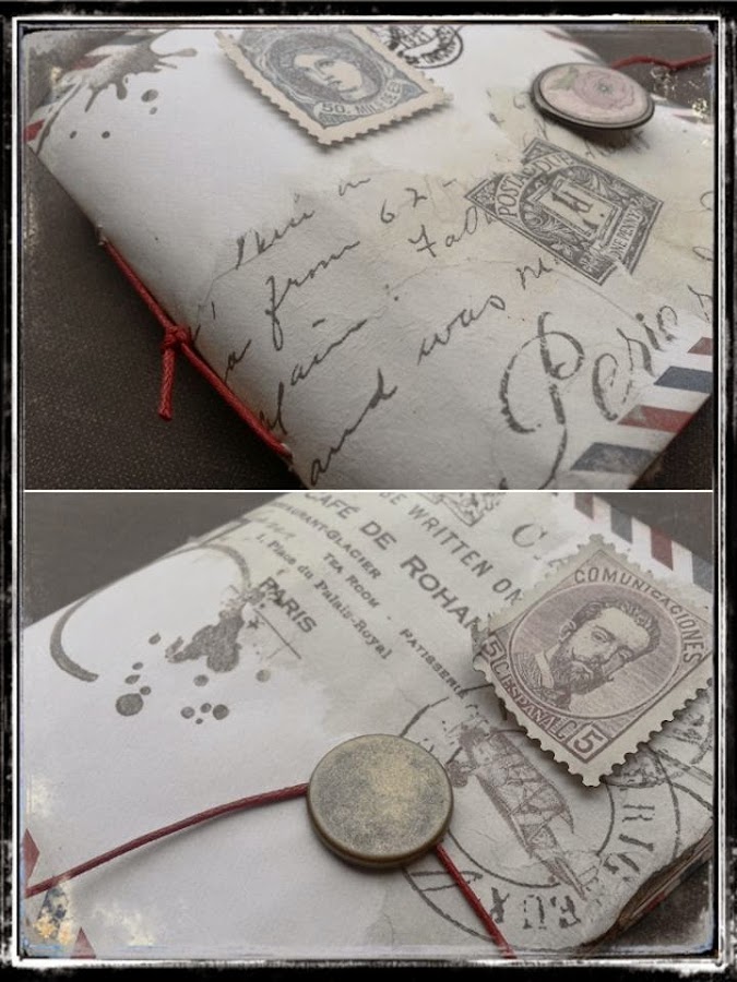 La otra encuadernación es con unos sobres de avión como portada; no son idea mía, de hecho los encontré en pinterest que me llevaron a una página donde las chica los vendía...me gustó la idea, e inspirándome en ella, hice mi propia versión, algo más cálidos . Découpage, sellos estampados, y sellos de correos, de mi colección particular ... me encantan!!! La encadernación un cosido sencillo en el lomo y que a la vez nos sirve para cerrar el cuaderno con la ayuda deun brad metálico...