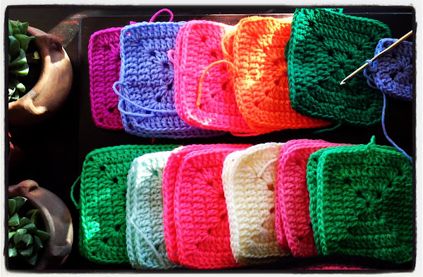 Tejer cuadrados me relaja, la mente se libera de todo lo malo del dia y hasta los hago sin mirar!