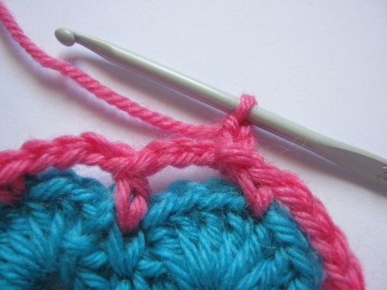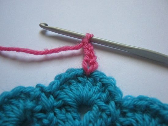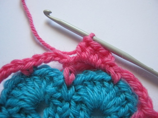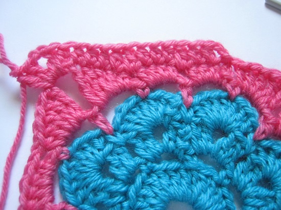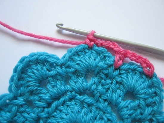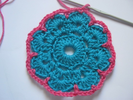 Continuar igual hasta darle la vuelta a la flor, al final, después de la última cadeneta, unir la vuelta al primer punto medio alto con un punto enano