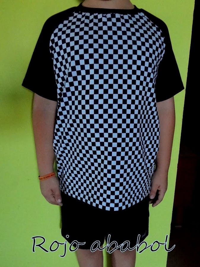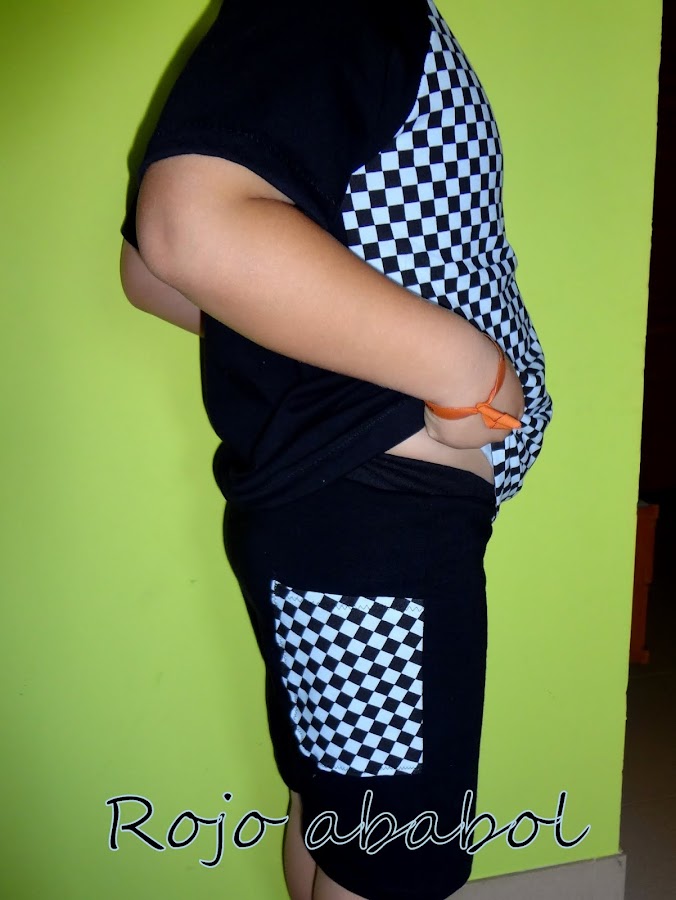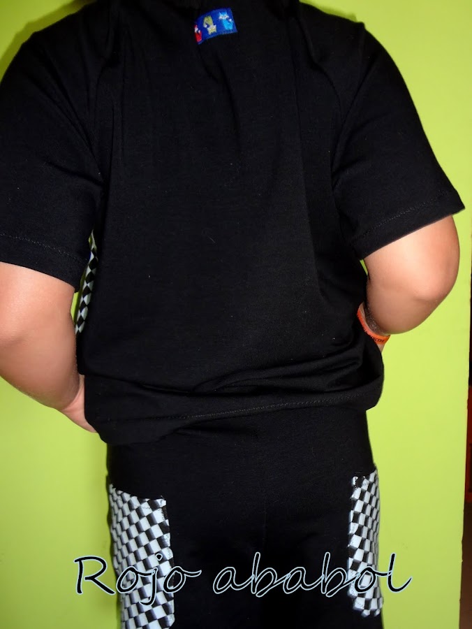 Repetimos patrón de camiseta y también de pantalón. Los mismos de la revista Ottobre que cosí AQUI. Para el pantalón sudadera de verano en color negro y para la camiseta punto jersey negro y estampado ajedrez. Puño en la cinturilla con goma para que ajuste mejor.