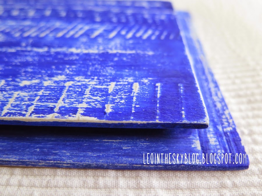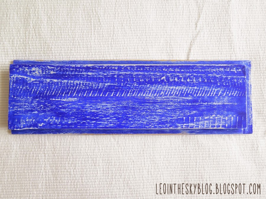 Lo primero que hice fue lijar bien la tapa, después le di una capa de nogalina para oscurecer la madera y una vez seca una capa de pintura blanca. Después pasé una vela por toda la superficie y apliqué pintura azul. Cuando secó la pintura lijé y quedó este precioso decapado que le da un aire a madera de deriva o algo parecido..., la verdad es que no era lo que tenía pensado en un principio, realmente había pensado en pintar o entelar la madera en un tono azul marino que es el que suele usarse en este tipo de cuadros, pero bueno, al final probé esto y me gustó así que se quedó así.