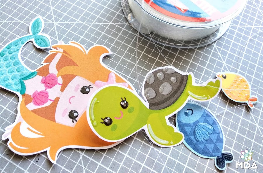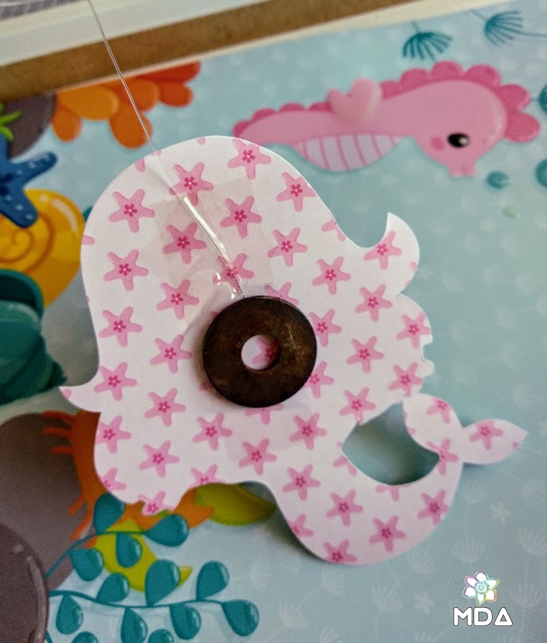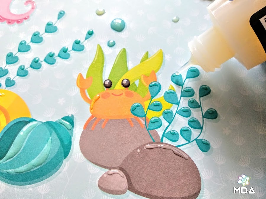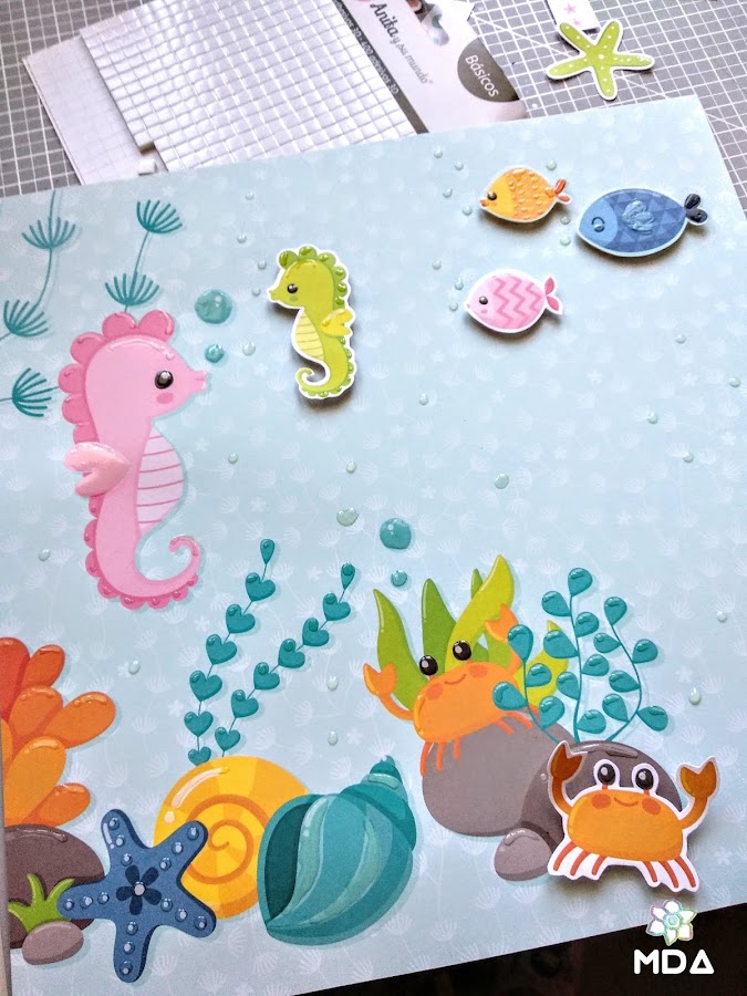 Cortamos el papel a la medida correspondiente de nuestro marco, en mi caso a 23 x 23 cm, y con pegamento tipo Glossy Accents vamos resaltando algunos detalles (burbujas, ojos, escamas...) tanto aquí como en los recortables que vayamos a utilizar. Así damos un efectos agua, estamos bajo el mar ,-)