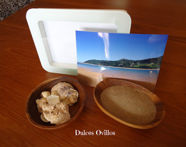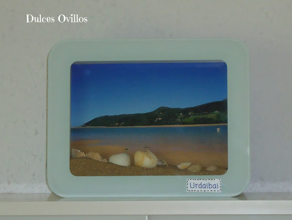 Y he tenido la arena y las conchas guardadas durante un año, así como el marco que encontré un día por casualidad en una tienda de decoración. No es muy frecuente encontrar este tipo de marcos, porque la mayoría de los que tienen profundidad llevan el cristal en el fondo del marco, así que cuando lo vi, no dudé en adquirirlo. Todavía me faltaba escoger la fotografía y llevarla a revelar, y esto me llevó medio año más. No veía el momento, porque siempre estoy liada con otros proyectos que me apremian. Pero en cuanto tuve los (sólo) cuatro materiales necesarios no hubo excusa. Y este es mi marco 3D recuerdo de vacaciones: