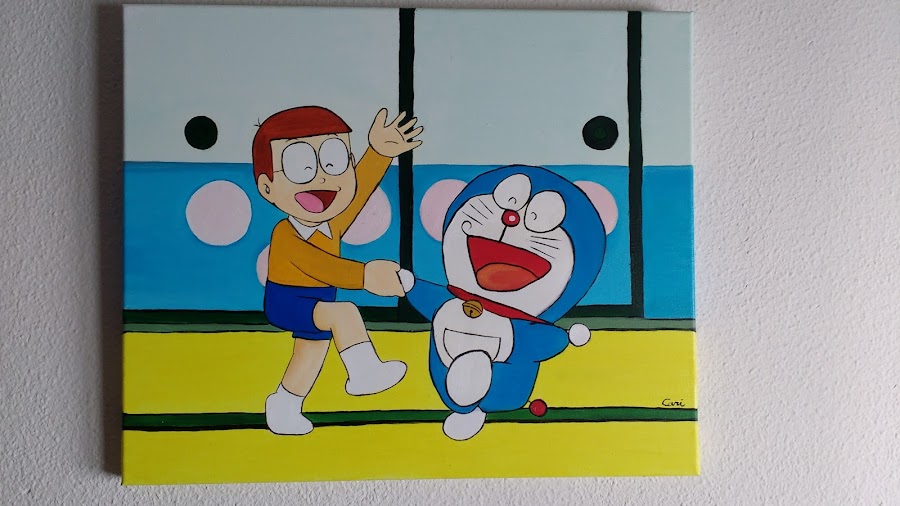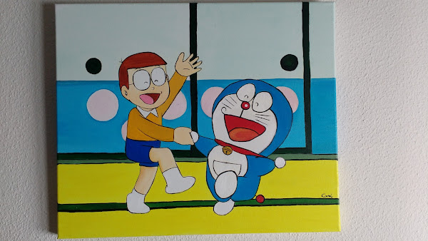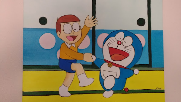 Hoy os enseño un cuadro pintado al oleo, que le hice a mi sobrino Joel por su cumpleaños. Como le gustan mucho los dibujos de Doraemon, busqué por internet estos dibujitos y elegí este que me pareció bastante alegre para un niño de 8 años.