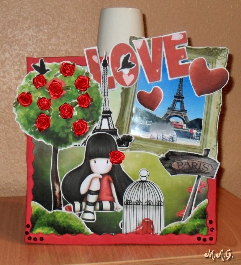 De momento, me estreno en nuestra "casita" con mi primer scrapbook que he hecho como regalo a mi marido para el día de San Valentín. Se trata de una muñeca de Suzanne Woolcott ( me encantan sus ilustraciones) sentada en la hierva bajo la Torre Eifell. Es una escena totalmente inventada, para nada planeada, sino que surgió con la marcha: un árbol floreado, un corazón atrapado (símbolo del amor), un cartelito dirección París, unos pajarillos..y una foto nuestra que me encanta de nuestro inolvidable viaje a la Ciudad del Amour hace casi tres años! con su marco y su mensaje...