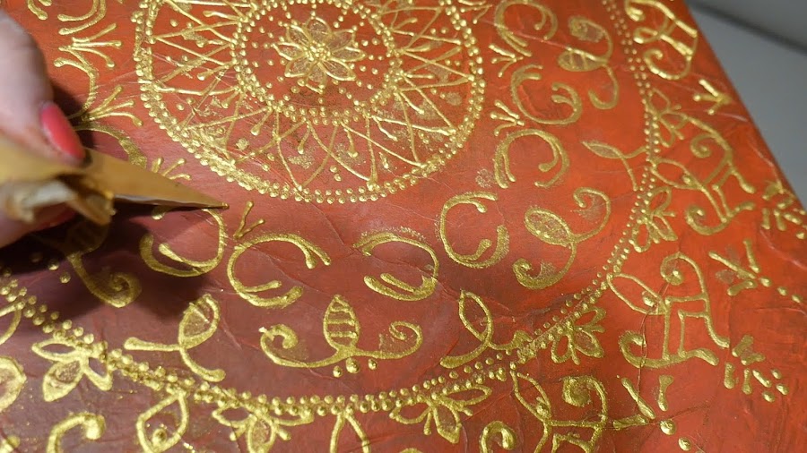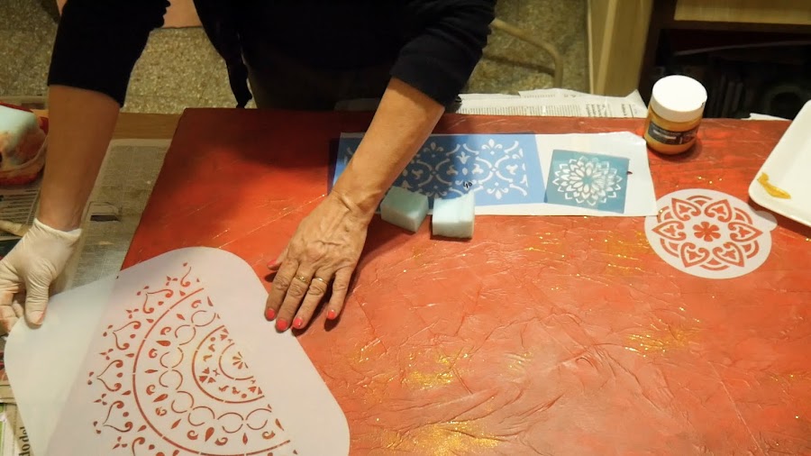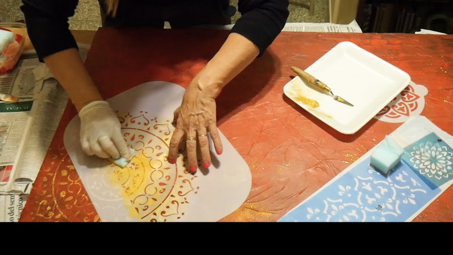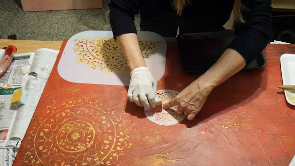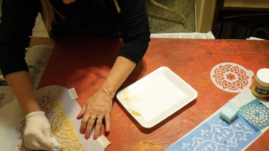 Para eso corté pedacitos de esponja y con pintura acrílica dorada comencé aplicando sobre la plantilla que había ubicado en uno de los extremos superiores, realicé una mitad lo deje secar un poco, ubiqué nuevamente la plantilla e hice la otra mitad igual.