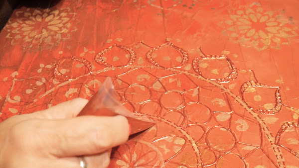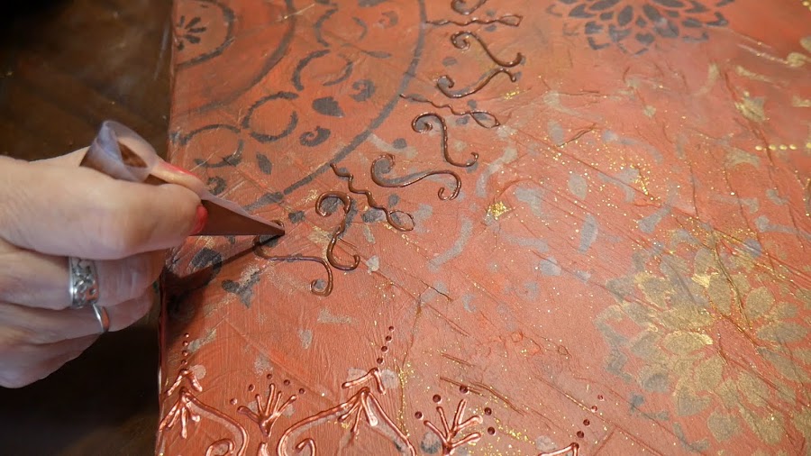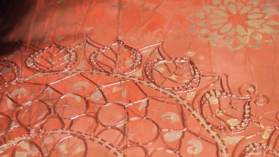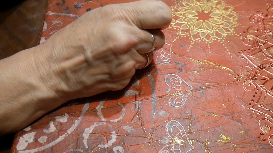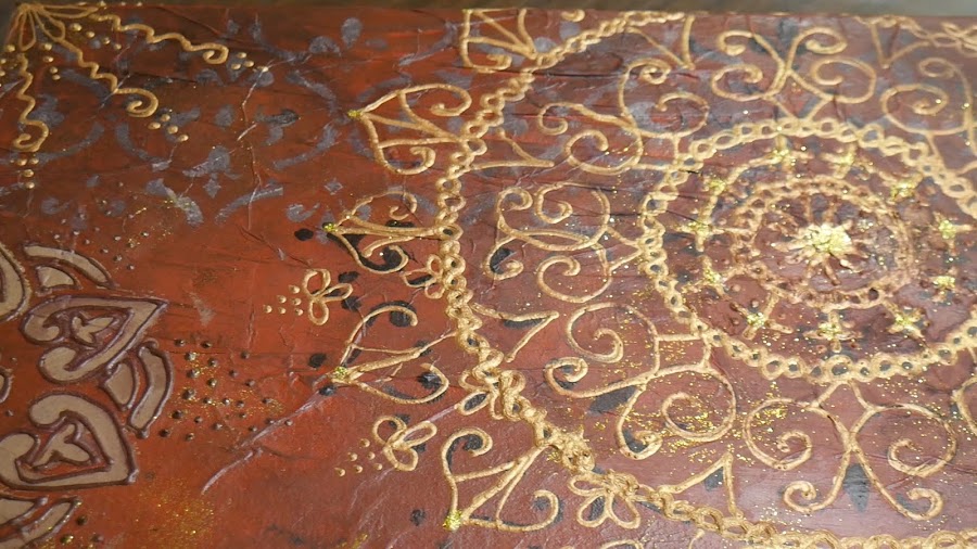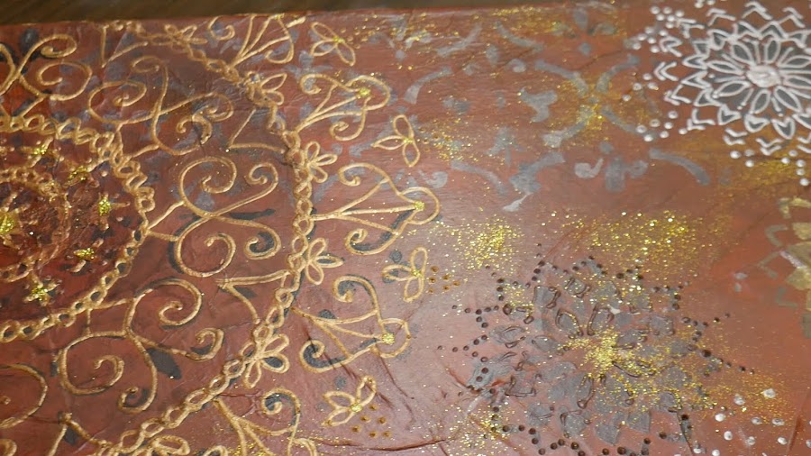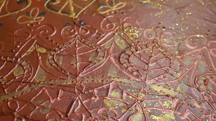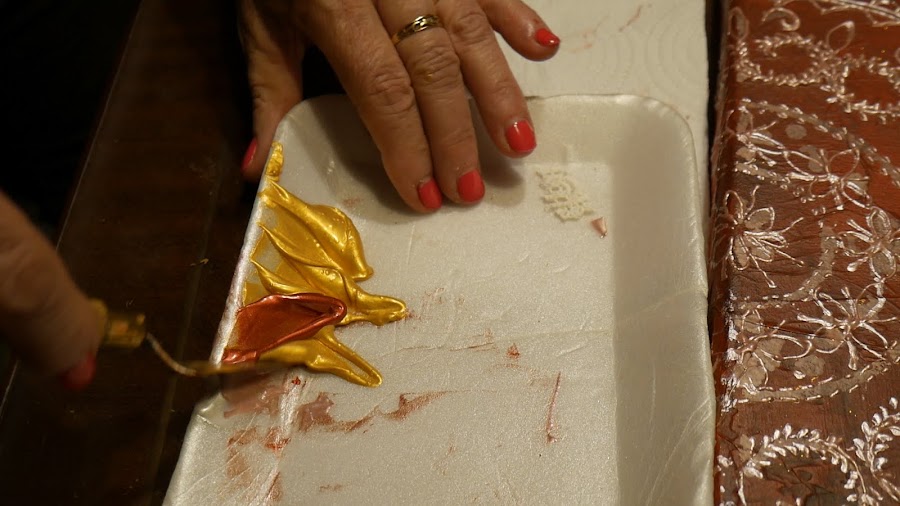 las pinturas acrílicas que emplee son dorados, cobre y blanco nacarado.