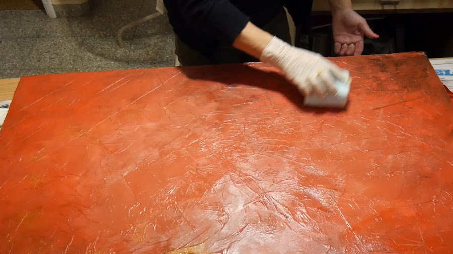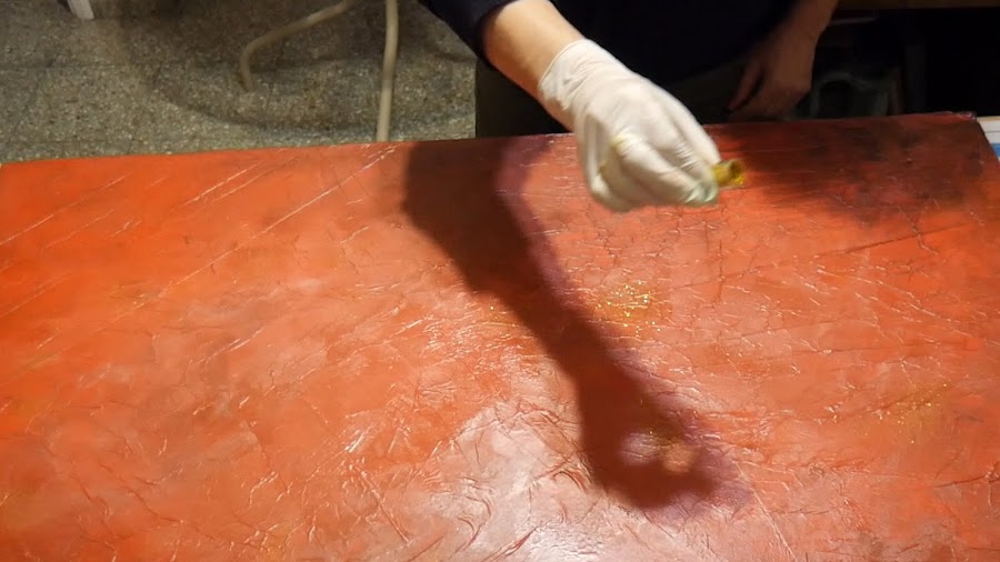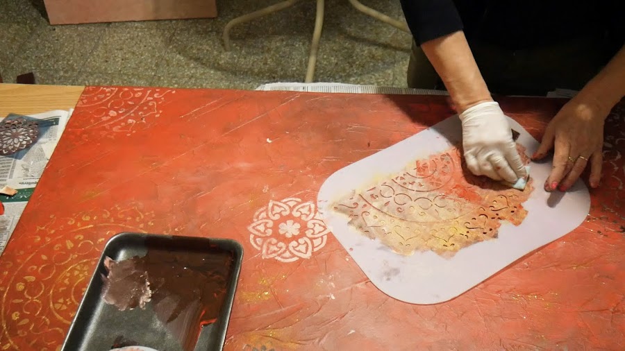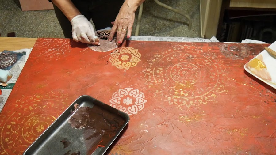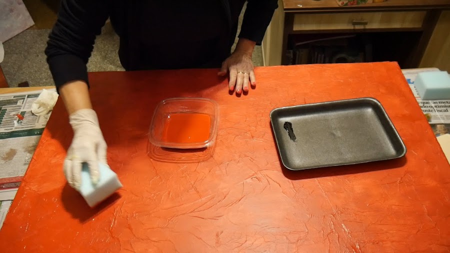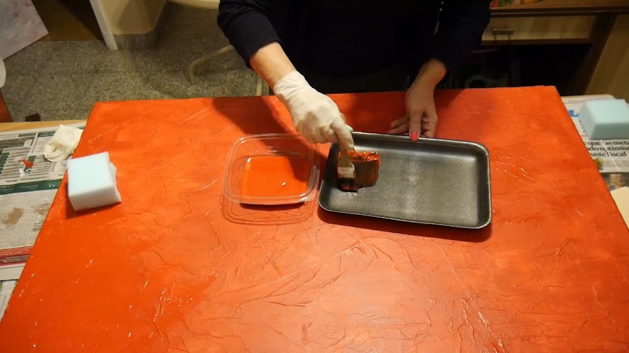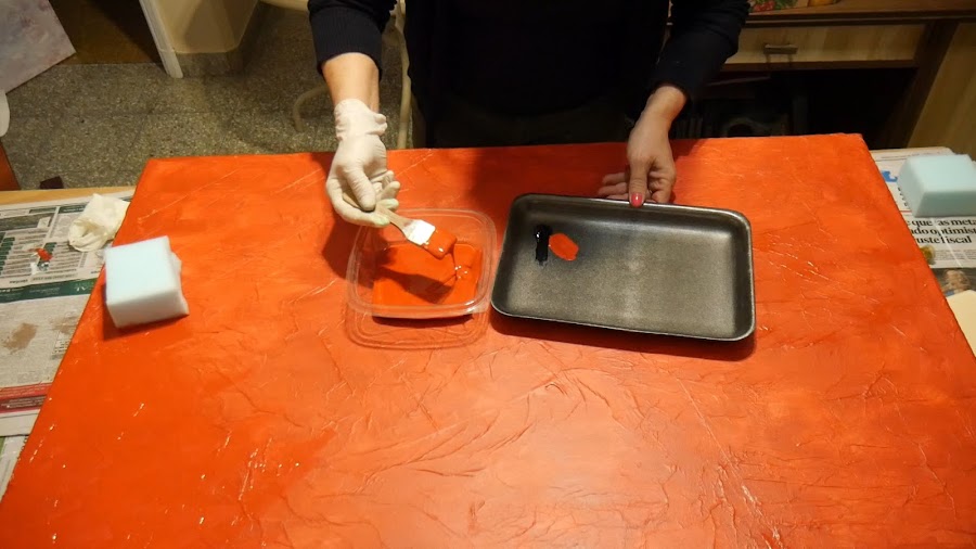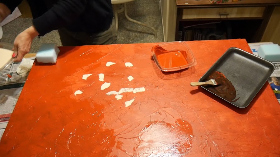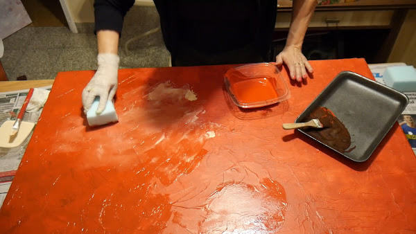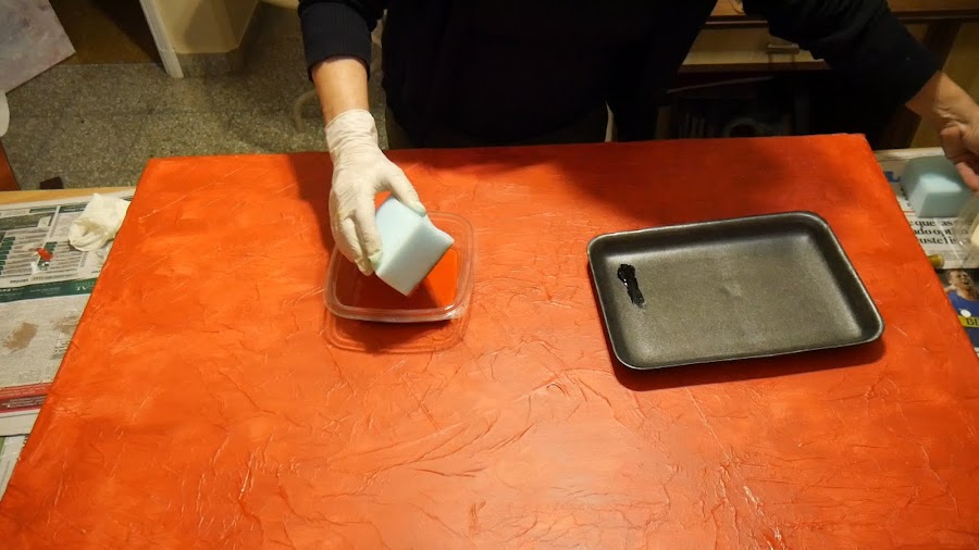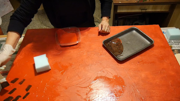 Mezclé con un pincel el acrílico negro con la pintura roja y con un pincel hice manchones sobre la pintura recién colocada y la volví a frotar con la esponja. Realicé esta tarea hasta que obtuve el color deseado.