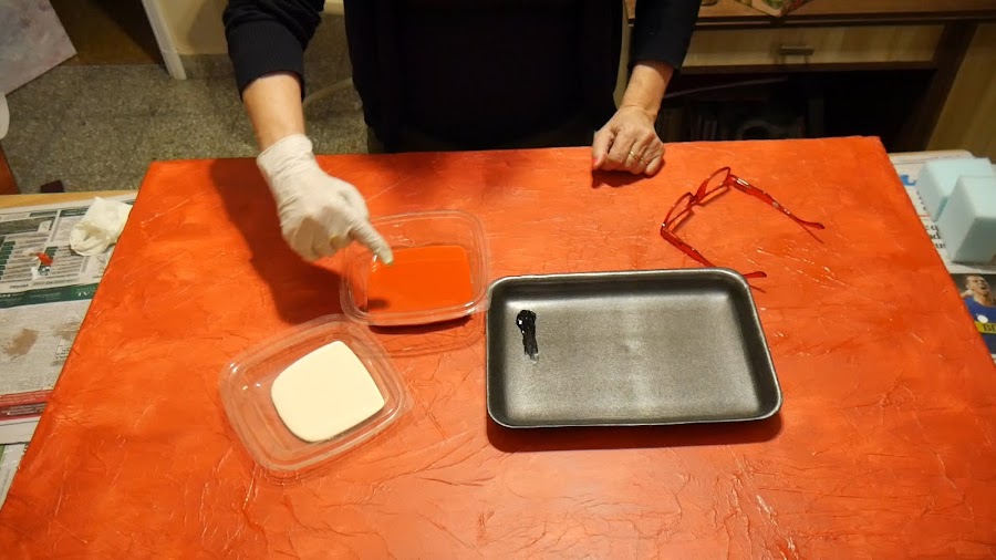 Coloqué en éste recipiente la misma pintura de fondo, en ésta bandeja un poco de pintura acrílica de color negro y este otro es un latex con el cual esta pintada la pared opuesta y que pertenece a la misma gama del rojo.