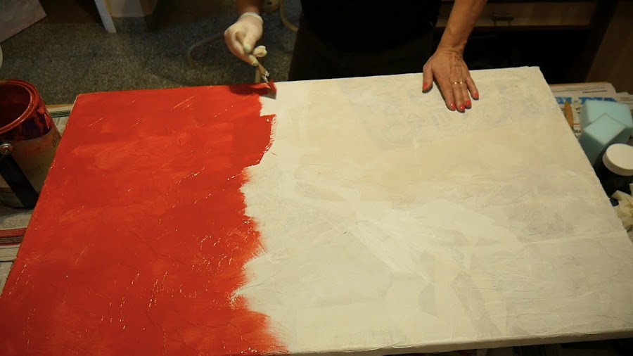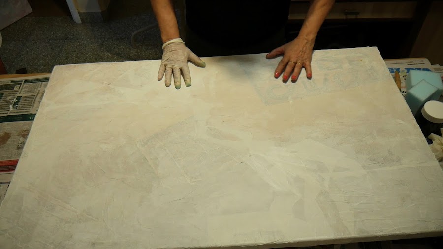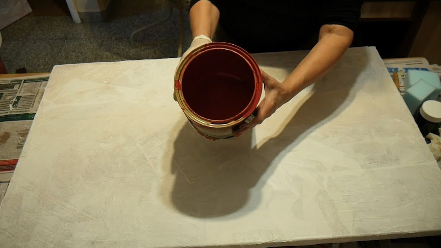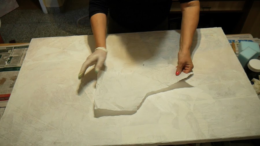 Como color de fondo utilicé el mismo latex con el que se pintó la pared, le apliqué una mano generosa con un pincel a toda la tela y a sus bordes, y se puede observar ahora las arrugas del papel.