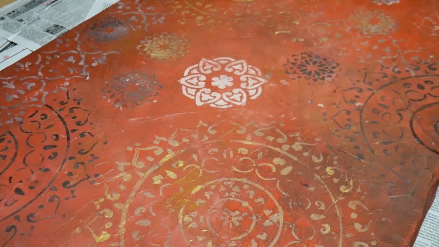 Como había dicho utilicé plantillas de mandalas que pinté dispersos por toda la tela.