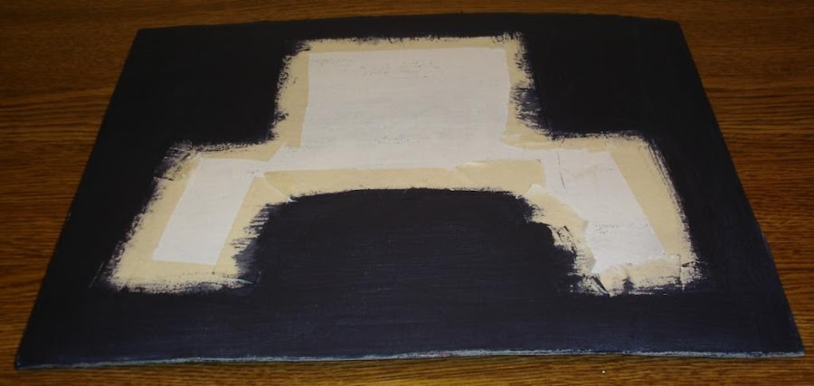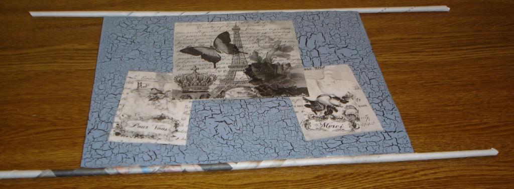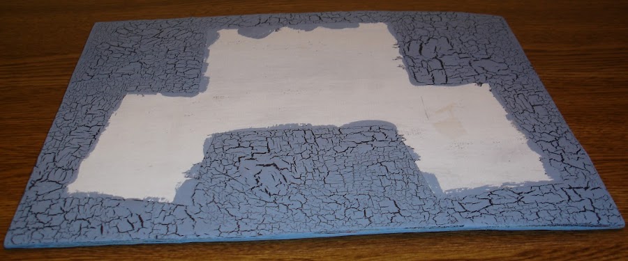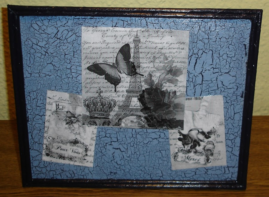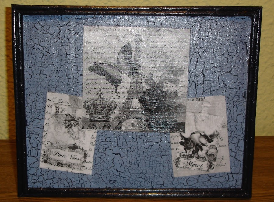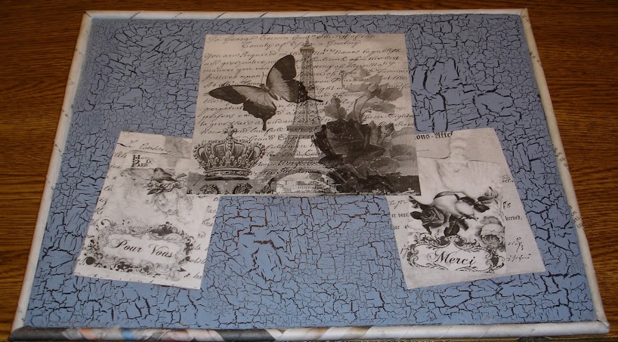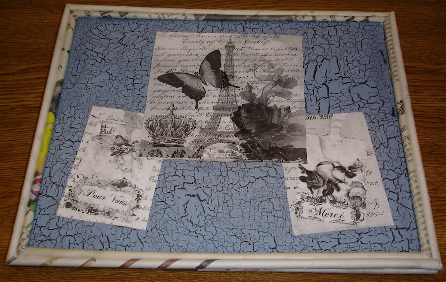 Para hacer el cuadro pegué dos cartones iguales para que fuera más resistente. Le di por delante imprimación blanca y luego pinté todo de azul oscuro, señalando primero con cinta carrocera dónde iba a colocar las láminas. Eché el craquelador de un paso y luego lo pinté con azul claro. Cuando todo estaba bien seco le pegué las láminas.