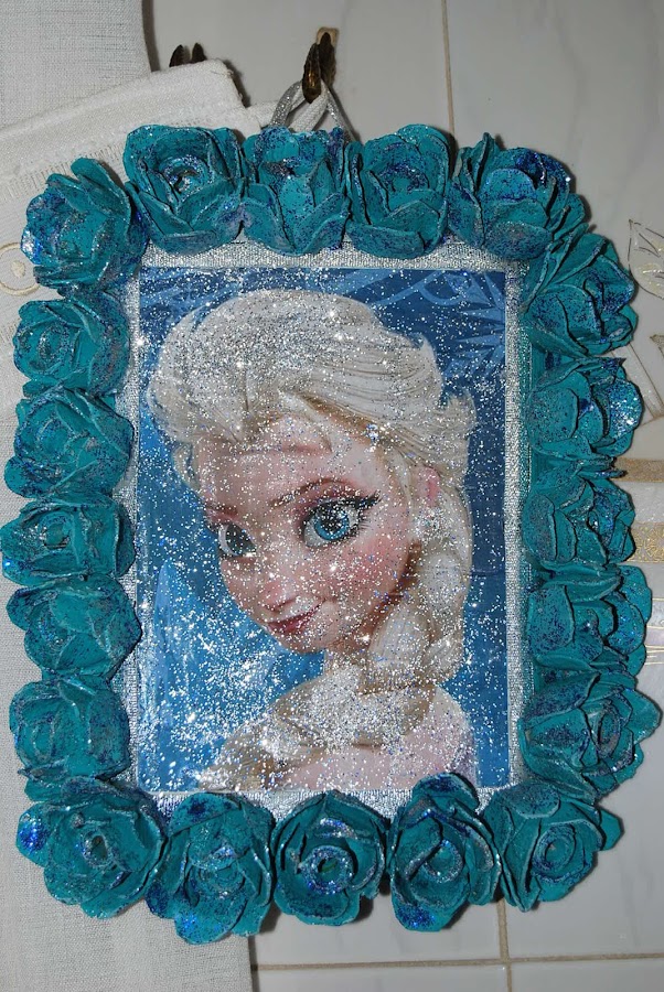 Y este es el final del trabajo, que debido al flash no se puede apreciar bien. Pero eso es lo que buscábamos, que brillara. Solo comentar que se ha puesto un lazo, atravesando dos agujeros en el borde de la bandeja, para poder colgar el marco en la pared.