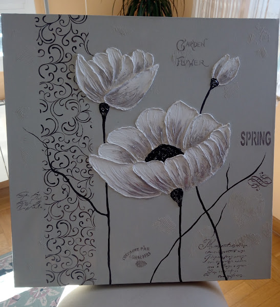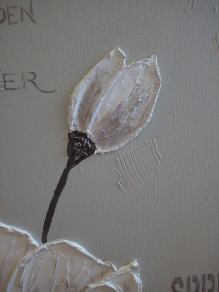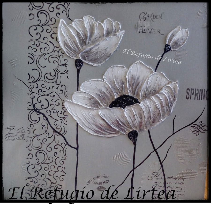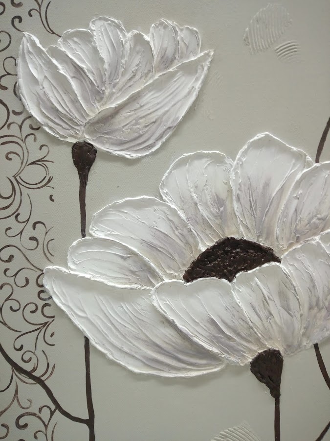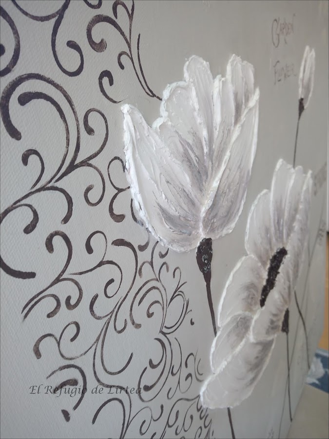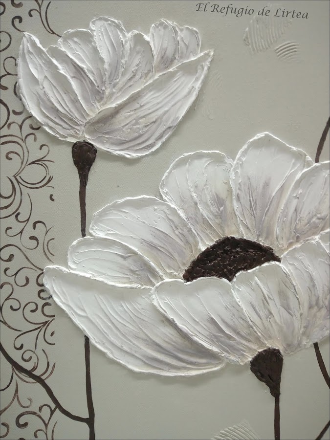 Es ir cogiendo estuco con la espátula e ir intentando depositarlo sobre el lienzo haciendo la forma de los pétalos y dando volumen. No me resultó fácil, pero poco a poco con la práctica va quedando mas o menos bien.