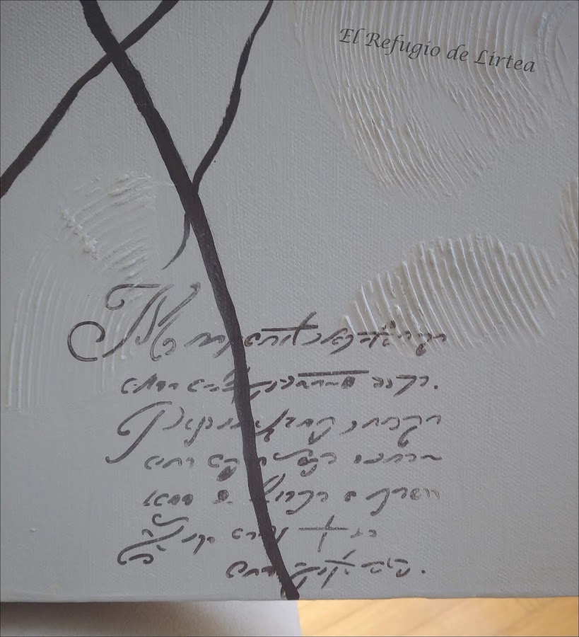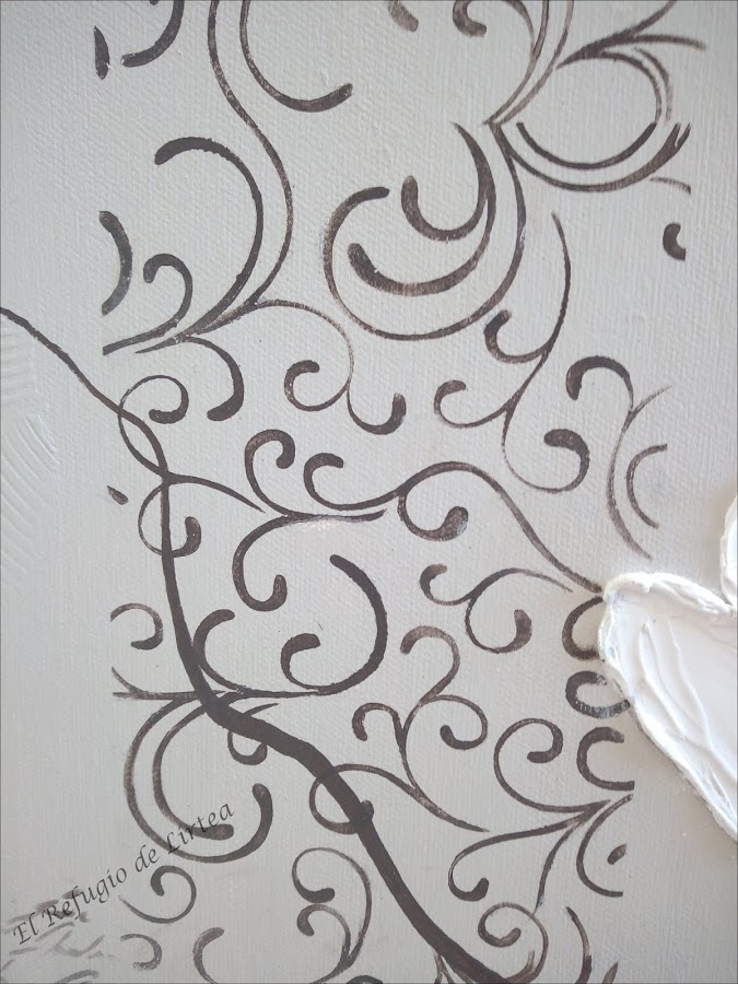Con un veteador o con un cepillo y estuco hacemos los relieves aquí y allá y los pintamos del mismo color que la base del cuadro, en color arena.