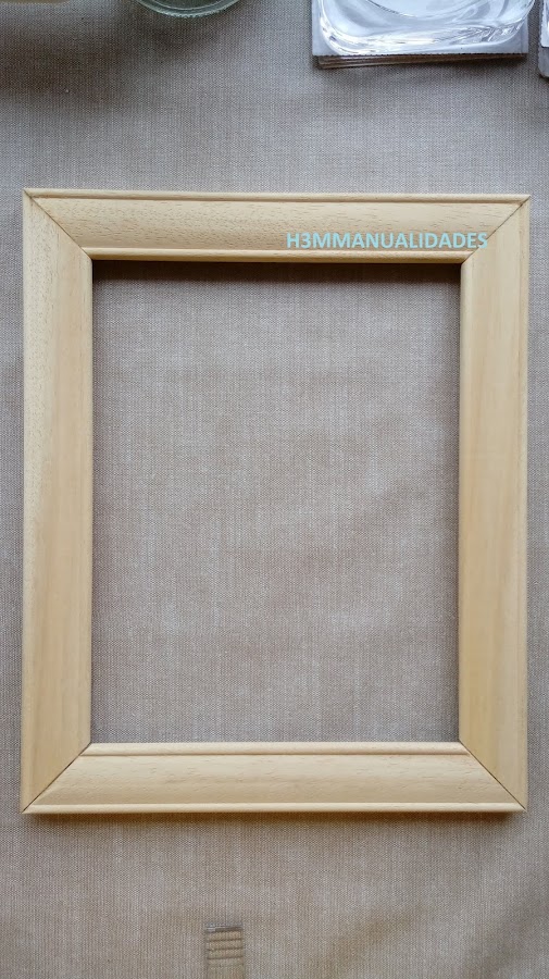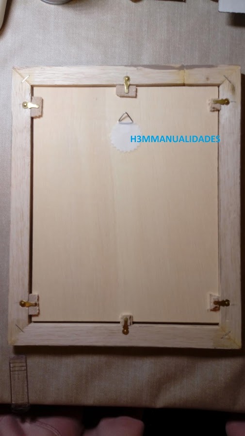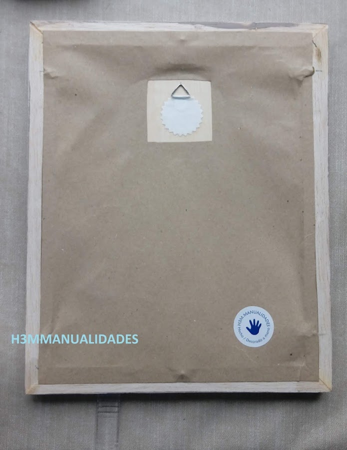 Todo el marco está barnizado con un par de capas de barniz mate. Pegamos el colgador y toda la trasera la forro con papel de embalar para darle un mejor acabado.