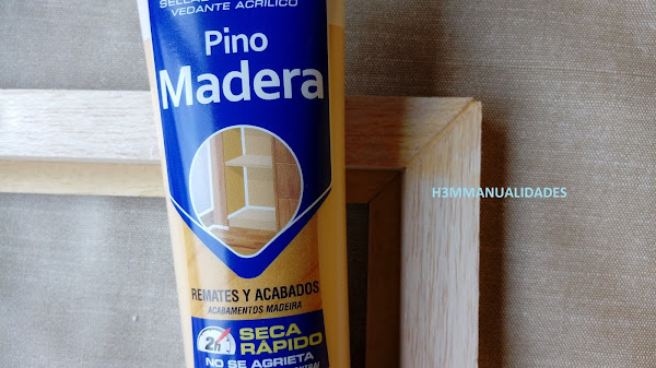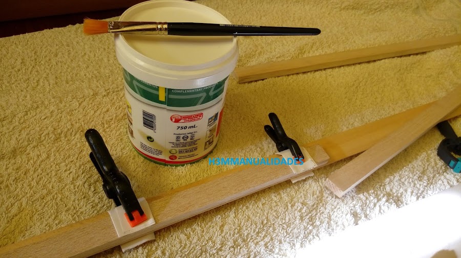 Digo desde cero porque el marco lo he hecho yo (¡es el segundo que hago!) y las flores también las he secado yo. Así que, completo. Apelo a tu paciencia pues para explicar el proceso voy a echar mano de más fotos de las que acostumbro a poner. Vamos allá: mientras las flores las voy secando en una prensa, con papel que voy cambiando cada cierto tiempo, voy haciendo el marco. Para ello pego con cola blanca un listón de madera de balsa a la moldura.