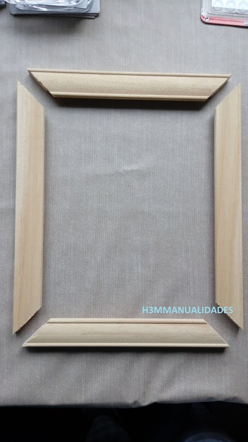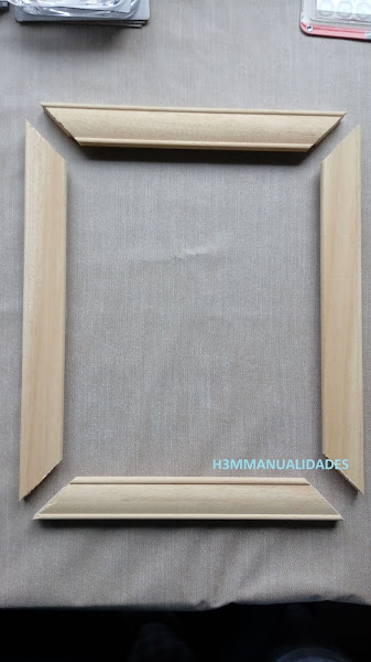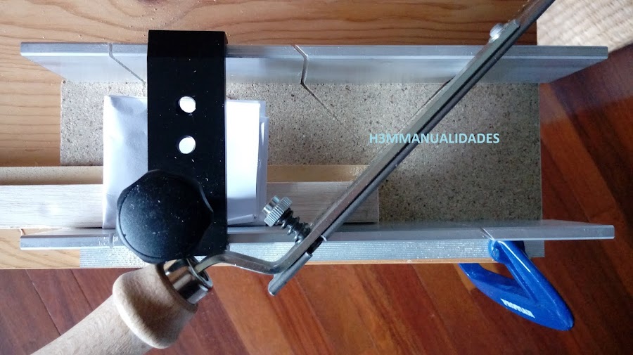 Con la ingletadora de mano voy cortando las cuatro piezas con sus ingletes. Aquí es importante coger bien las medidas y cortar lo que queremos. Yo me suelo guiar por la medida que quiero que me quede de interior, y desde ahí, el inglete.