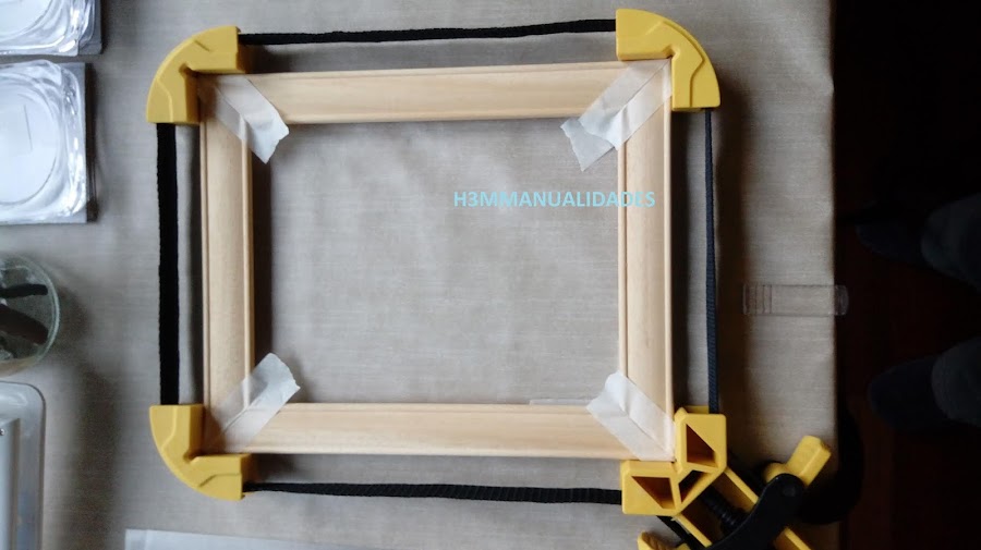 Lijamos bien los cortes y con ayuda de una pequeña escuadra metálica pego las cuatro piezas y ajusto para que queden escuadradas las esquinas. Sujeto todo con una cinta que ejerce presión y mantiene la posición, y lo dejo unas horas.