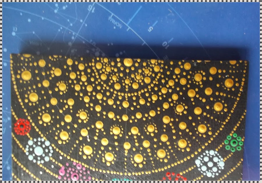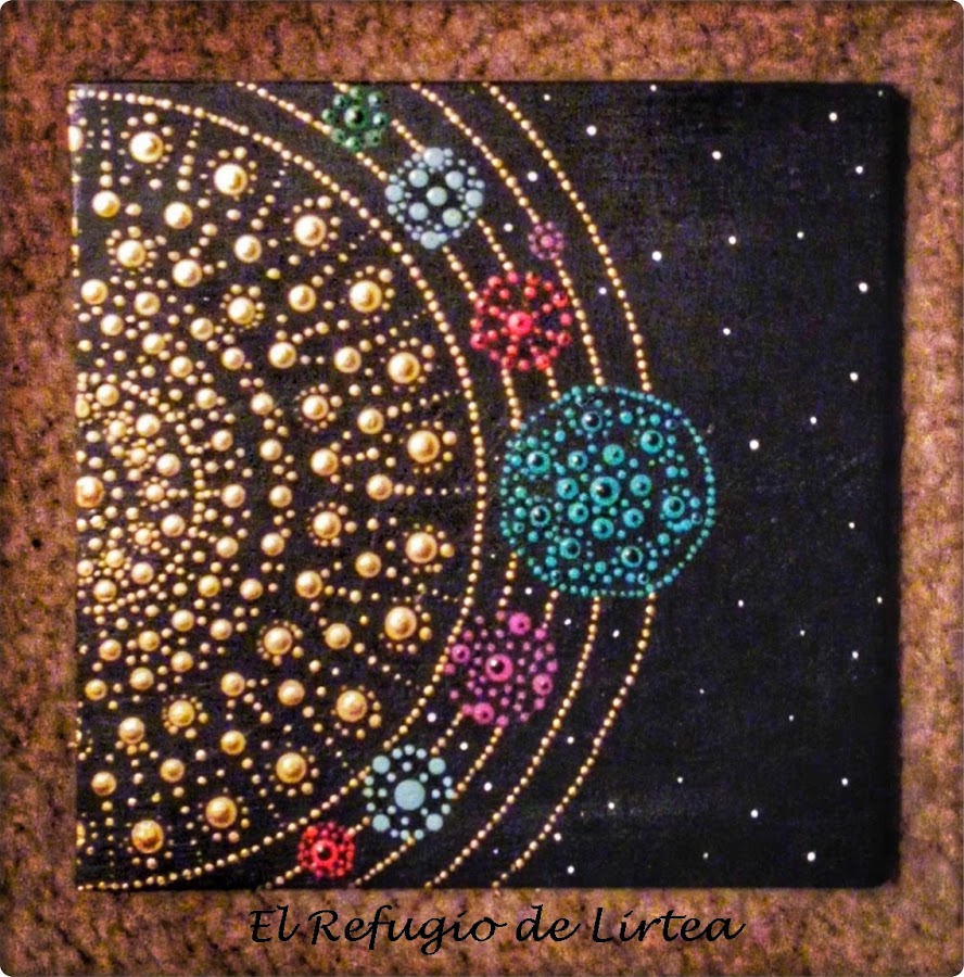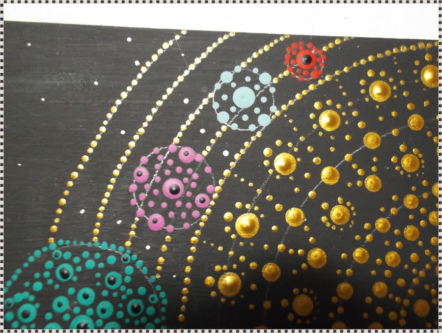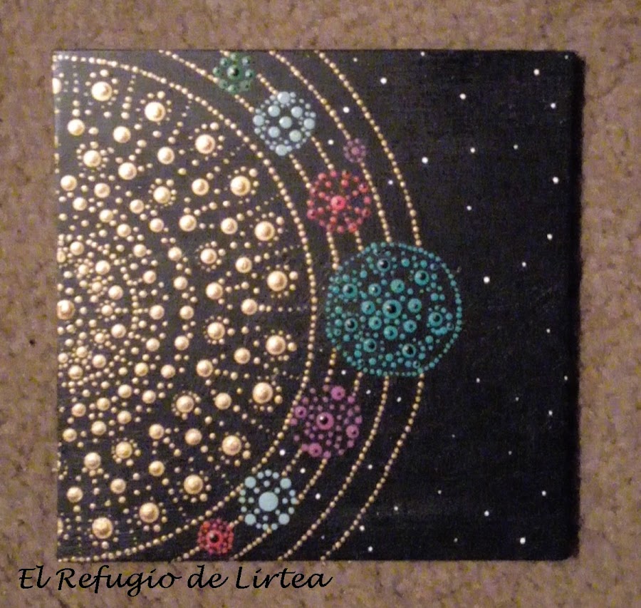 Cuando tuve todo realizado, con la pintura negra hice puntos negros encima de algunos de colores y puse pequeños puntos blancos a modo de pequeñas estrellas.