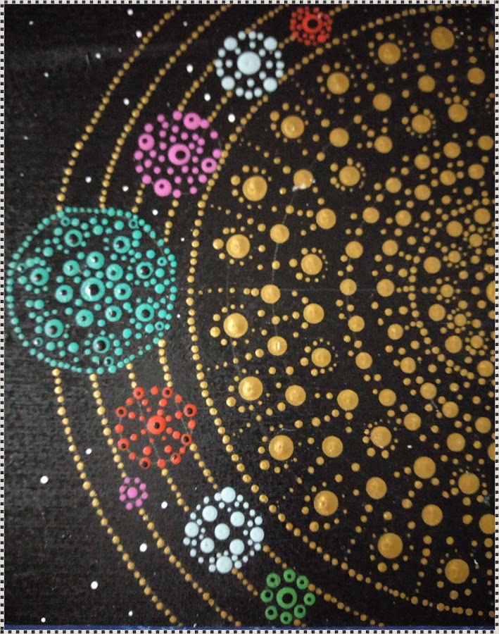 Las pinturas que se utilizo son pinturas acrílicas, son las ideales para esta técnica al ser pinturas con cierta cremosidad y con la densidad ideal para que cuando se haga el punto quede una pequeña sobreelevación. Esta elevación es lo que hace que la composición tenga cierto relieve y profundidad.Creo que lo podéis apreciar en la imágen de abajo.