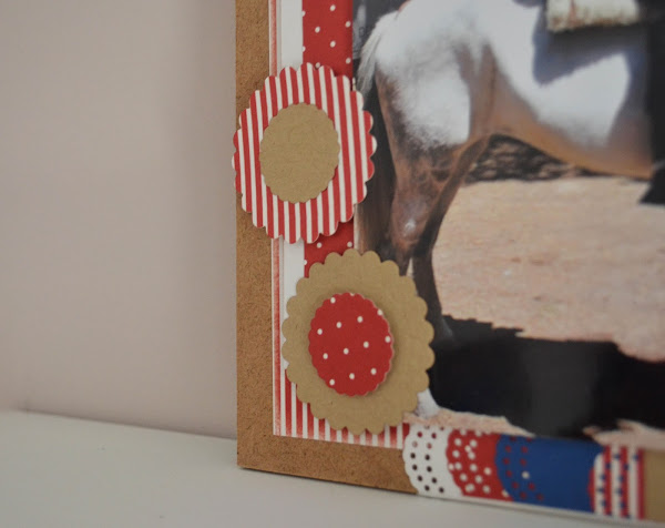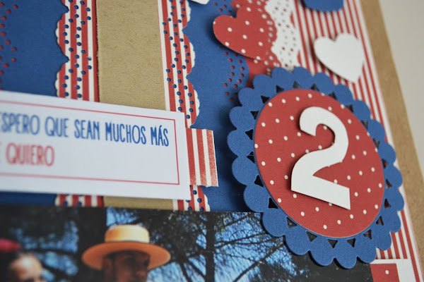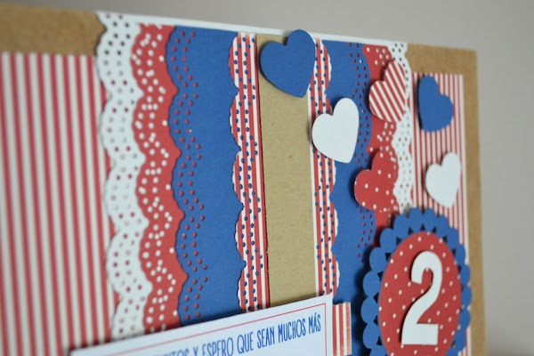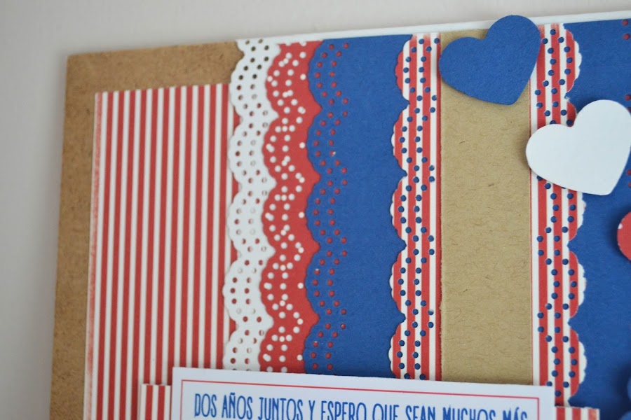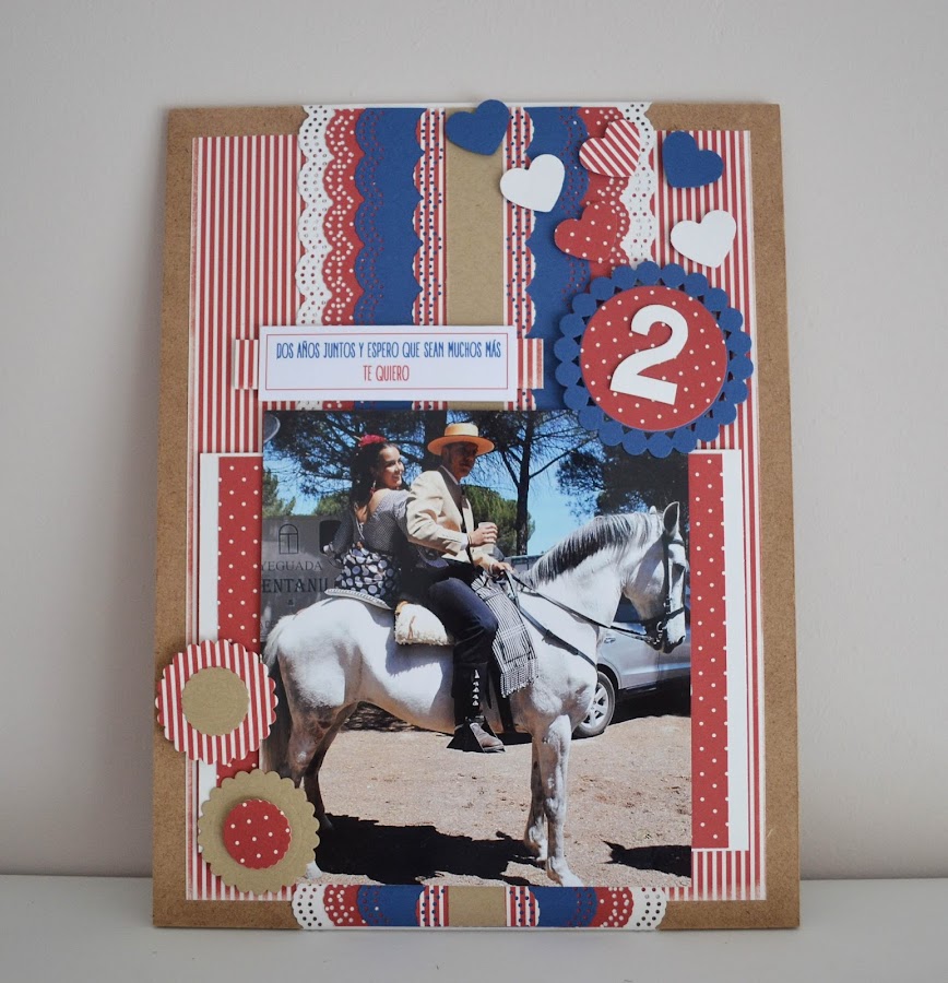Es un cuadro en vertical en colores rojo oscuro, azul, blanco y madera. En la parte central he colocado la foto y unas bonitas cenefas. Está decorado con corazones y rosetones.