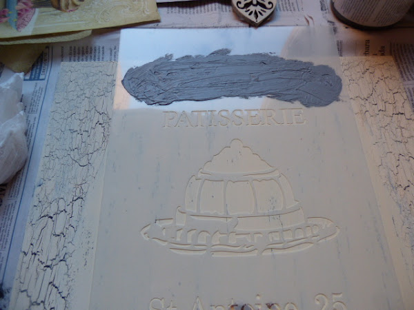 Pasta de relieve teñida con Chalky reliquia y esta plantilla de la que he utilizado sólo el copete que lleva arriba, aunque el tema de la plantilla también le iba fenomenal