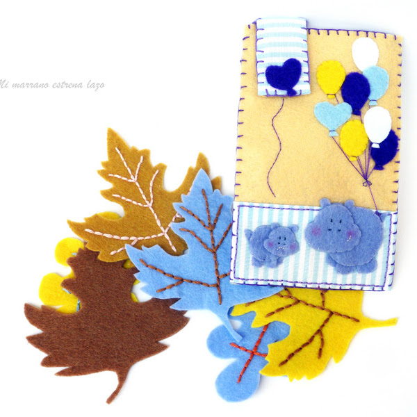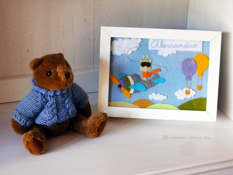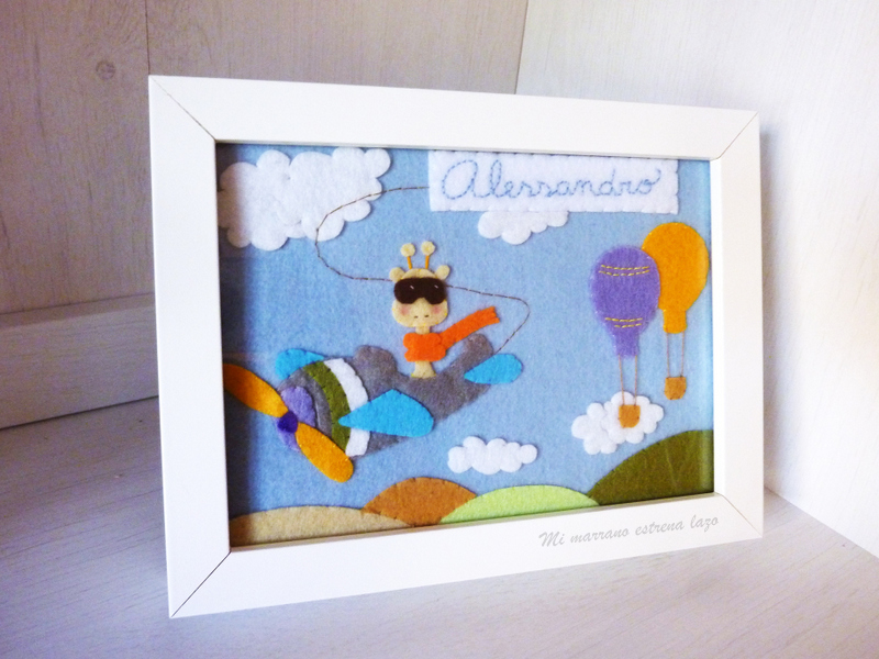 Bueno, pues aquí la tenéis, esta tooodo, completamente cosido a mano, y todos los elementos que veis están realizados en fieltro y cortados también a mano, para todos mis trabajo de fieltro no hay troqueles que valgan. Para ese cuadro en particular he utilizado azules y amarillos, principalmente porque es así es la habitación del peque que va a disfrutar de esta jirafilla tan simpática Para ambientar un poco hay una foto con mi osito romeo lo tengo desde miles de años) y con mi super gato de amigurumi, el gato Matias!