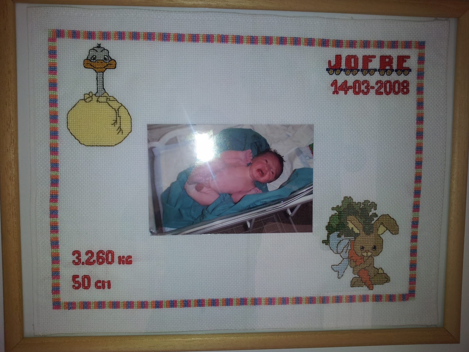 Este es el cuadro que le hice a mi niño cuando nació. Con el tiempo que ha pasado y todavía he de llevarlo a enmarcar, porque este es un marco de esos comprados, y el marco hace mucho la verdad.