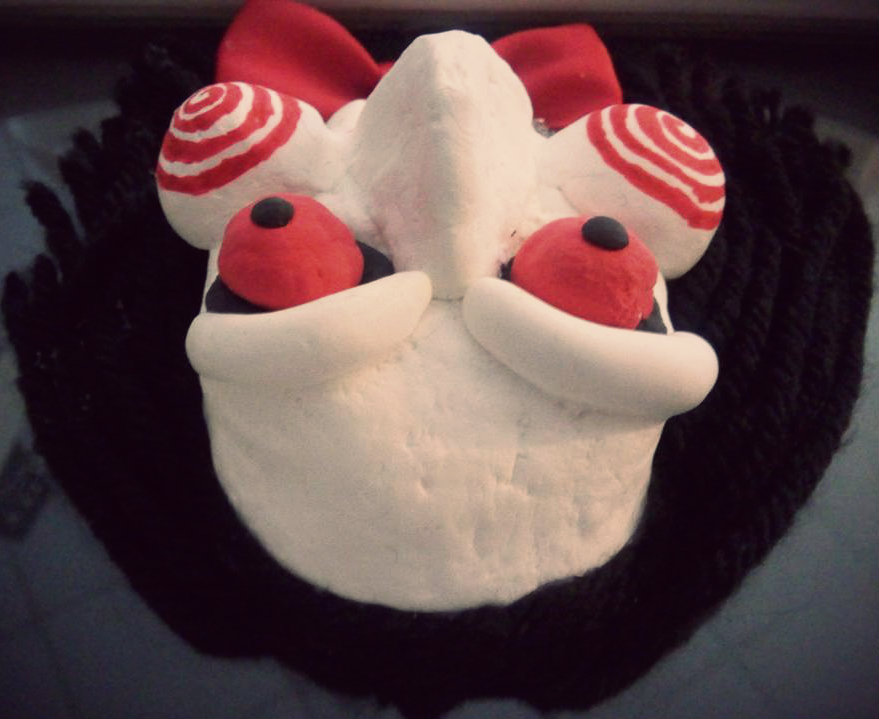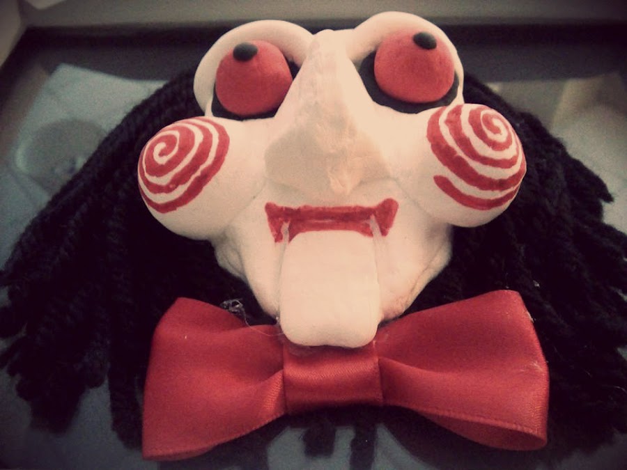 Se trata del famoso muñeco de Saw, hecho totalmente a mano en arcilla blanca, roja y negra, le hemos pintado algunos detalles cono las espirales de los pómulos o la boca y añadido lana negra para el pelo y una pajarita hecha con un lazo rojo.