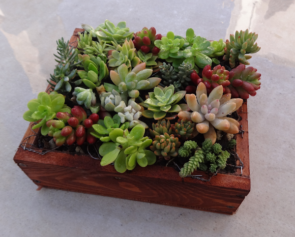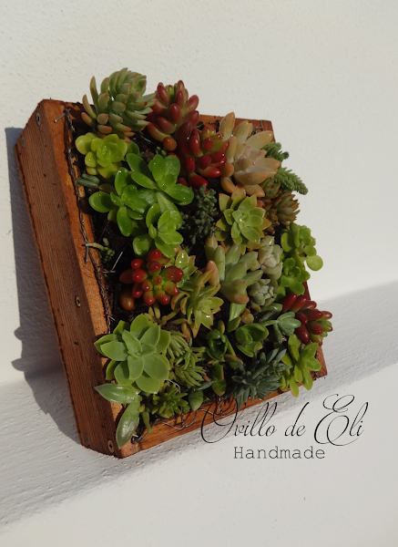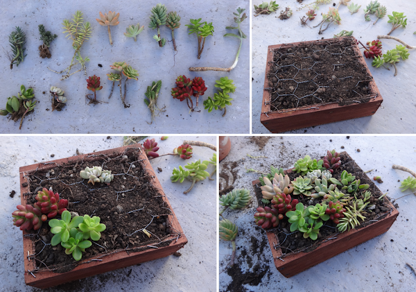 Y finalmente pase a la sección de jardinería, seleccioné las suculentas, preparé una mezcla de tierra para plantas con otra que tiende a hacerse algo dura, para que con el tiempo la tierra obtenga firmeza y poder colocar el cuadro en posición vertical, por los orificios de la malla he introducido cuidadosamente las plantas y aunque ellas sobreviven a todo lo que se les presente, aun trasplantarlas sin raíz, he tenido cuidado que que quedaran lo suficientemente profundas