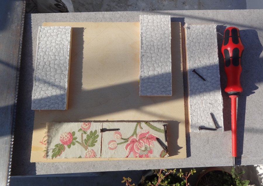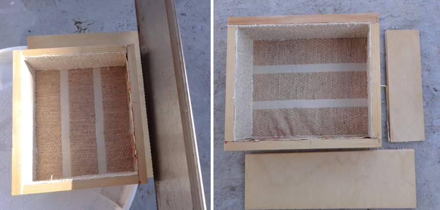 La parte interesante de la construcción de la caja, para mi, es el fondo, me gusta mostrar este pasaje porqué lo aprendí en el taller de un carpintero de muchos años de experiencia: coloqué los laterales sobre el fondo, marqué la posición, coloqué la tela y fijé con clavos la madera del fondo, recorté la tela excedente