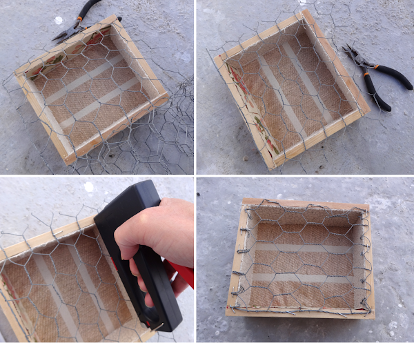 En esta parte medí y corte la malla de gallinero y la fijé con una grapadora especial de carpintería a la caja, los sobrantes de alambre los doble primero en gancho y luego los escondí hacia adentro, para evitar que alguien se lastime al manipular el cuadro... y ya quería saltar a la parte de la jardinería