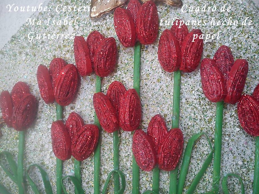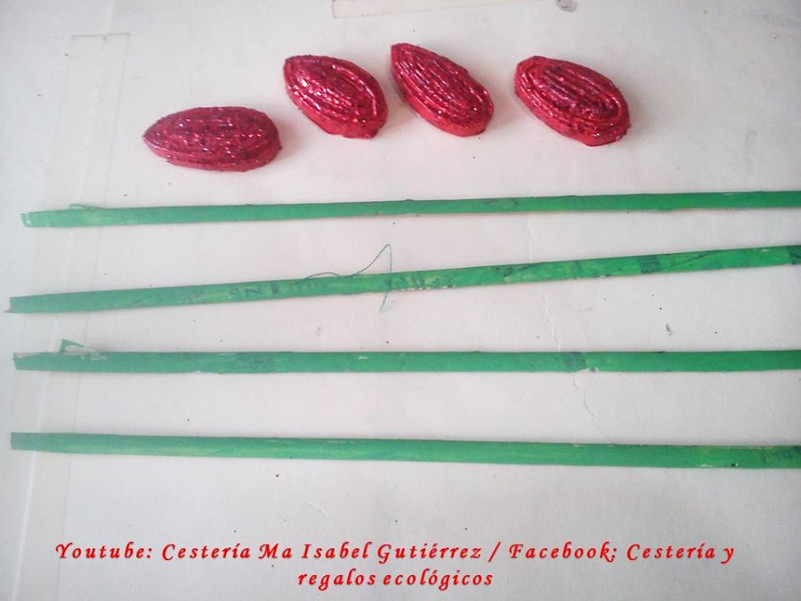 Hacemos las piezas de las flores. Cortamos las varillas de papel de manera que todas tengan la misma medida de largo, en este caso miden 25 cms., de largo, tomamos una ponemos pegamento a todo lo largo y doblamos un poco en un extremo tal como se ven la imagen...
