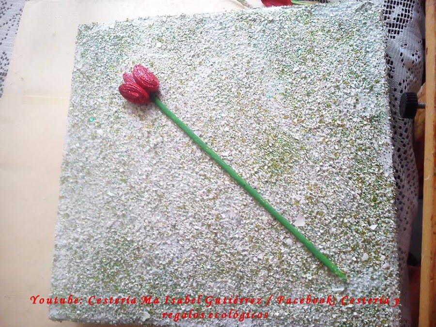 Empezamos a pegar las flores. Primero pegamos, con silicón, un tallo verde en medio de una esquina y otra. Luego, pegamos una pieza roja derecha y una pieza a cada lado como se ve en la imagen...