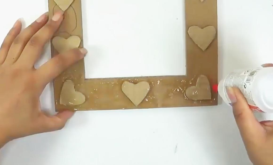 Corta corazones de cartón o cualquier otra figura que prefieras y los pegas en el marco con silicona caliente.