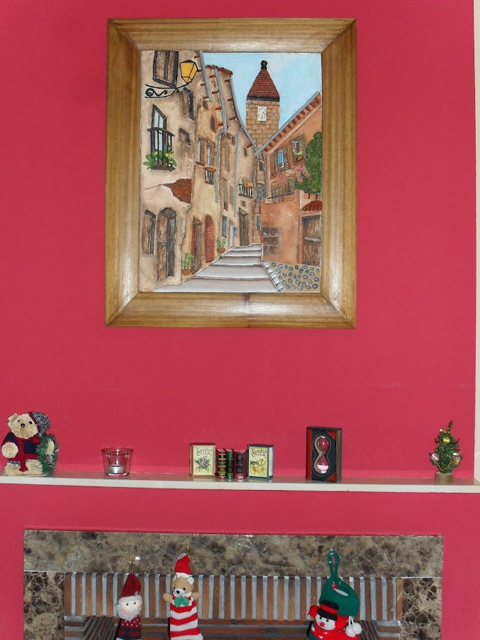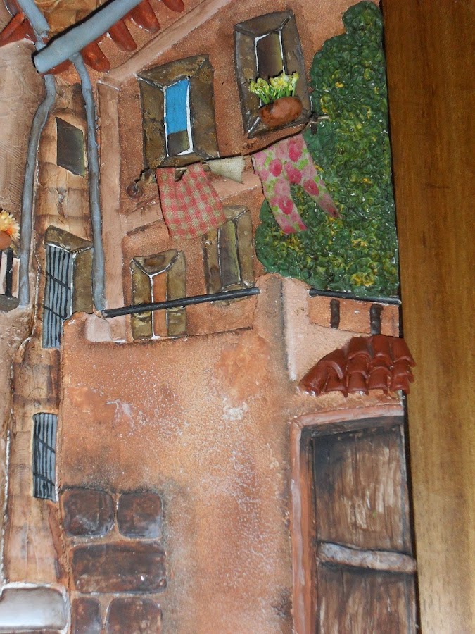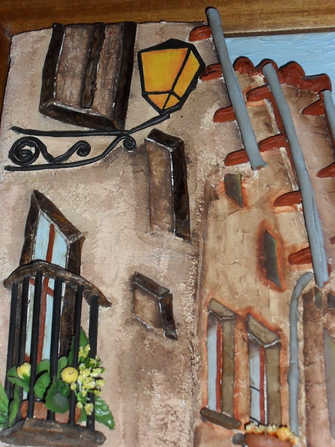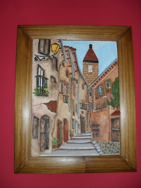 Hola Amigas: Os presento este cuadro que pinté el año pasado.. Me encanta hacer manualidades y pintar...porlotanto a este cuadro se me ocurrió la idea de hacerle algunas zonas en relieve..La fachada tiene un poquito de relieve con plaste y el color,, aunque luego retoqué con sombras. Las rocas tambien con plaste y dando mas relieve con la espátula,, haciendole las grietas y recodos...aunque lueg ...