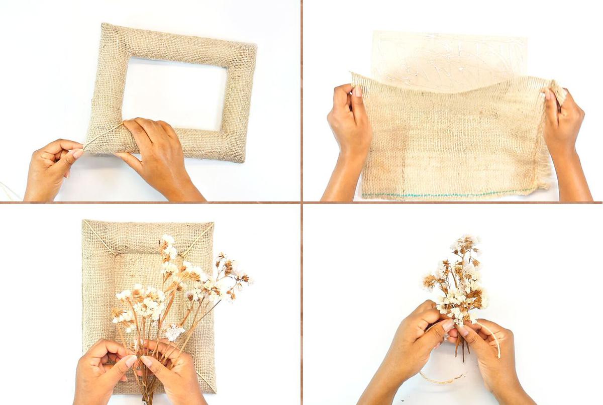 Tomar las flores secas, elegir las mejores y hacer un ramito de flores del tamaño del interior del marco.