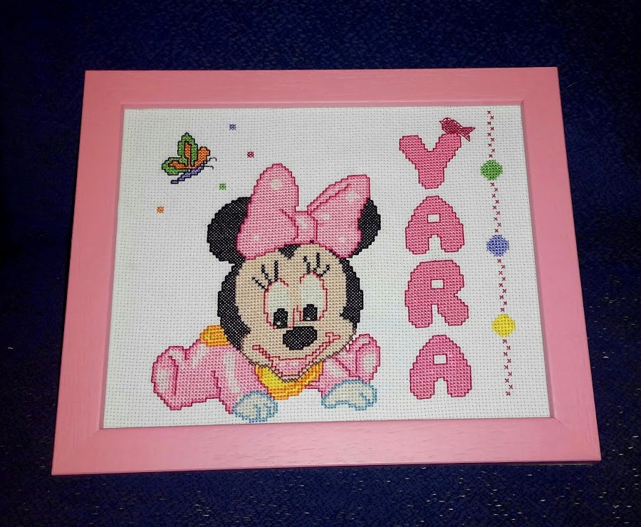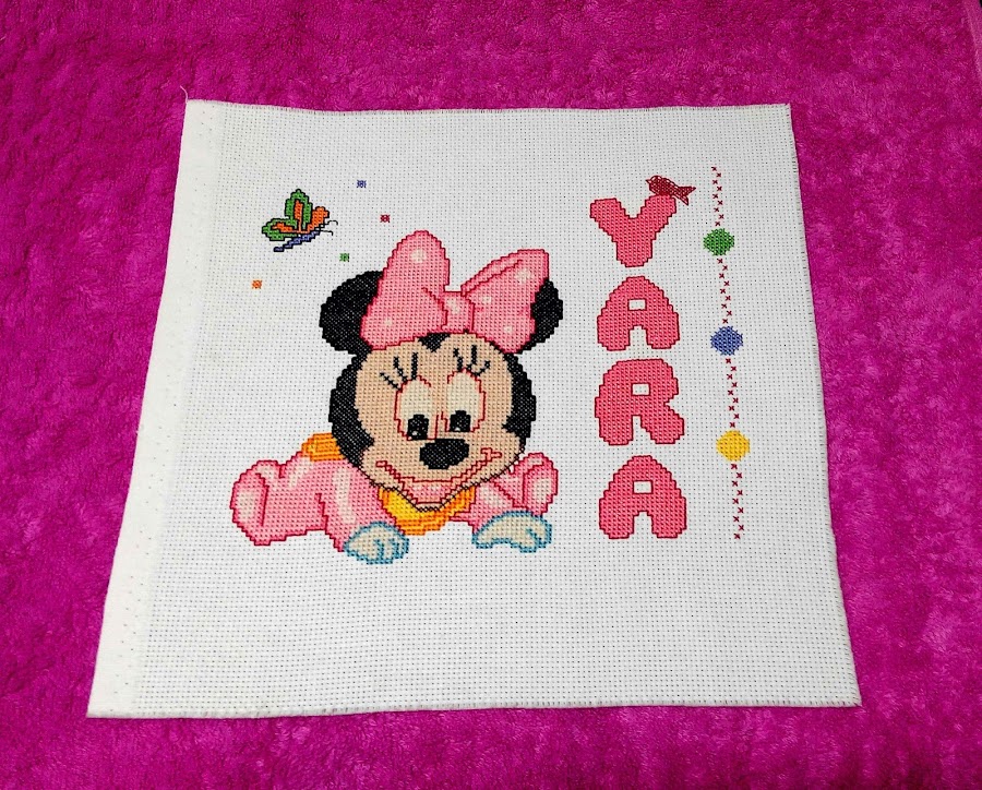 Esta vez, se trata de un motivo Disney realizado a punto de cruz, con el nombre de la niña, que por cierto, es muy original y bonito, Yara.