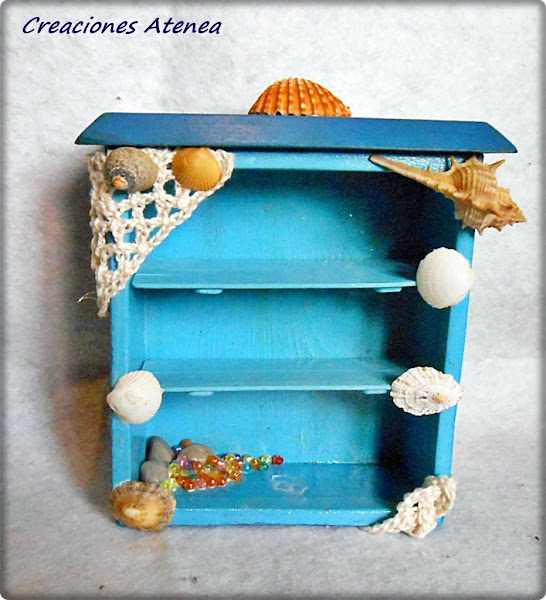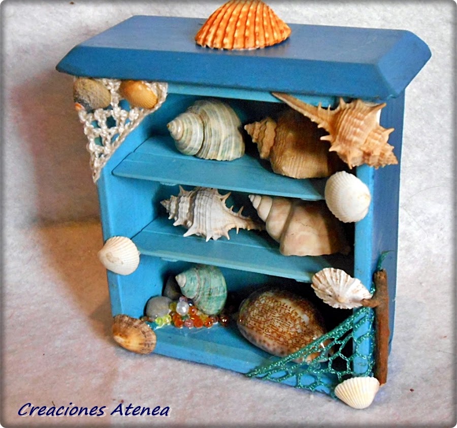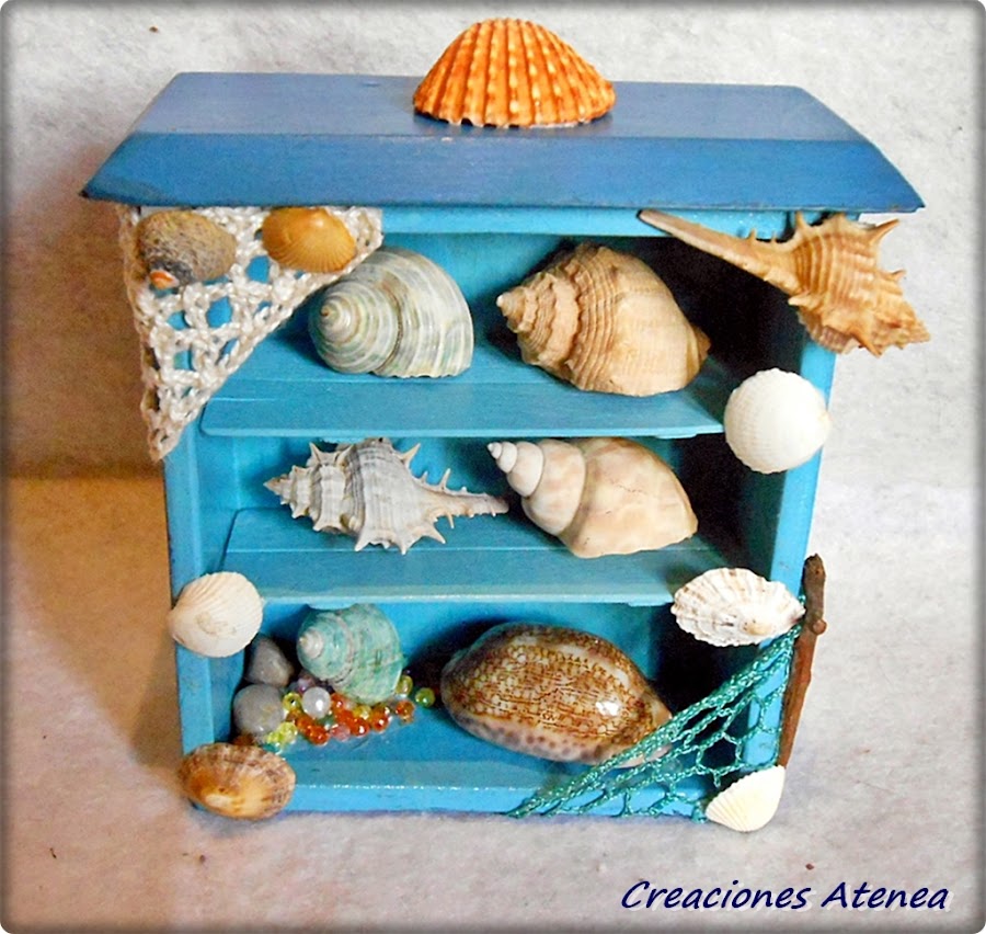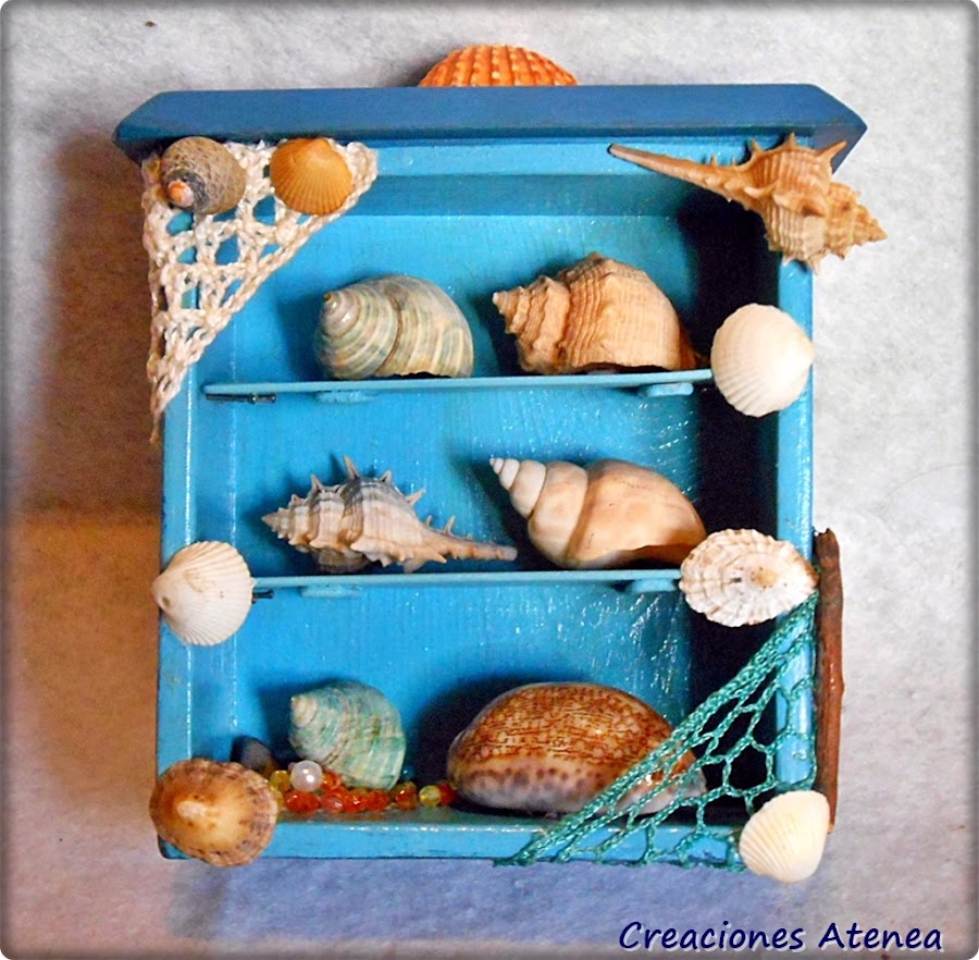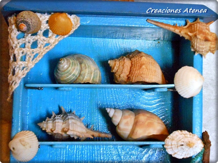 Aquí se ve el color de la parte superior (el mismo de los laterales) y la bonita concha que encontré no sé donde que ahora corona el cuadrito marinero. Espero que os haya gustado.